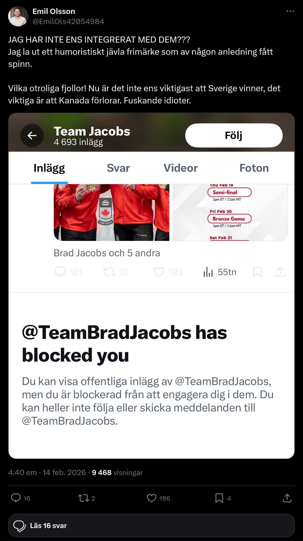 mrplebmon on 14/02/2026 18:51 Töntarna har blockat folk från att kommentera deras senaste inlägg på X 😂😂