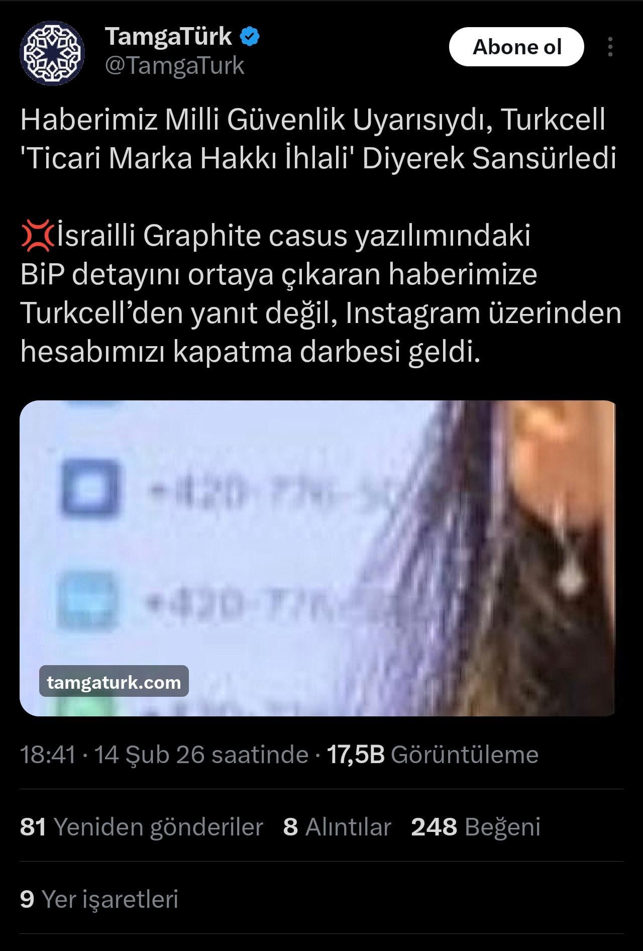 Turkcell ha chiuso l’account Instagram di TamgaTürk presentando una denuncia non correlata per “violazione dei diritti di marchio” a causa di una notizia secondo cui l’applicazione BiP di Turkcell era tra gli obiettivi nel pannello di controllo dello spyware chiamato Graphite della società israeliana Paragon.