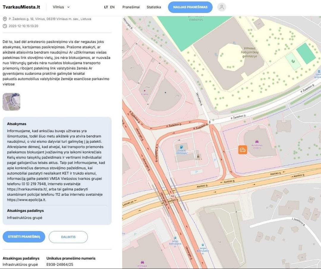 Molti di noi passano ogni giorno davanti al parcheggio accanto allo showroom “Autofortas” (P. Žadeikos str. 1B) e probabilmente hanno pensato che la barriera lì significasse una proprietà privata. Ma la verità è un’altra: si è trattato di un’appropriazione arbitraria dello spazio pubblico.