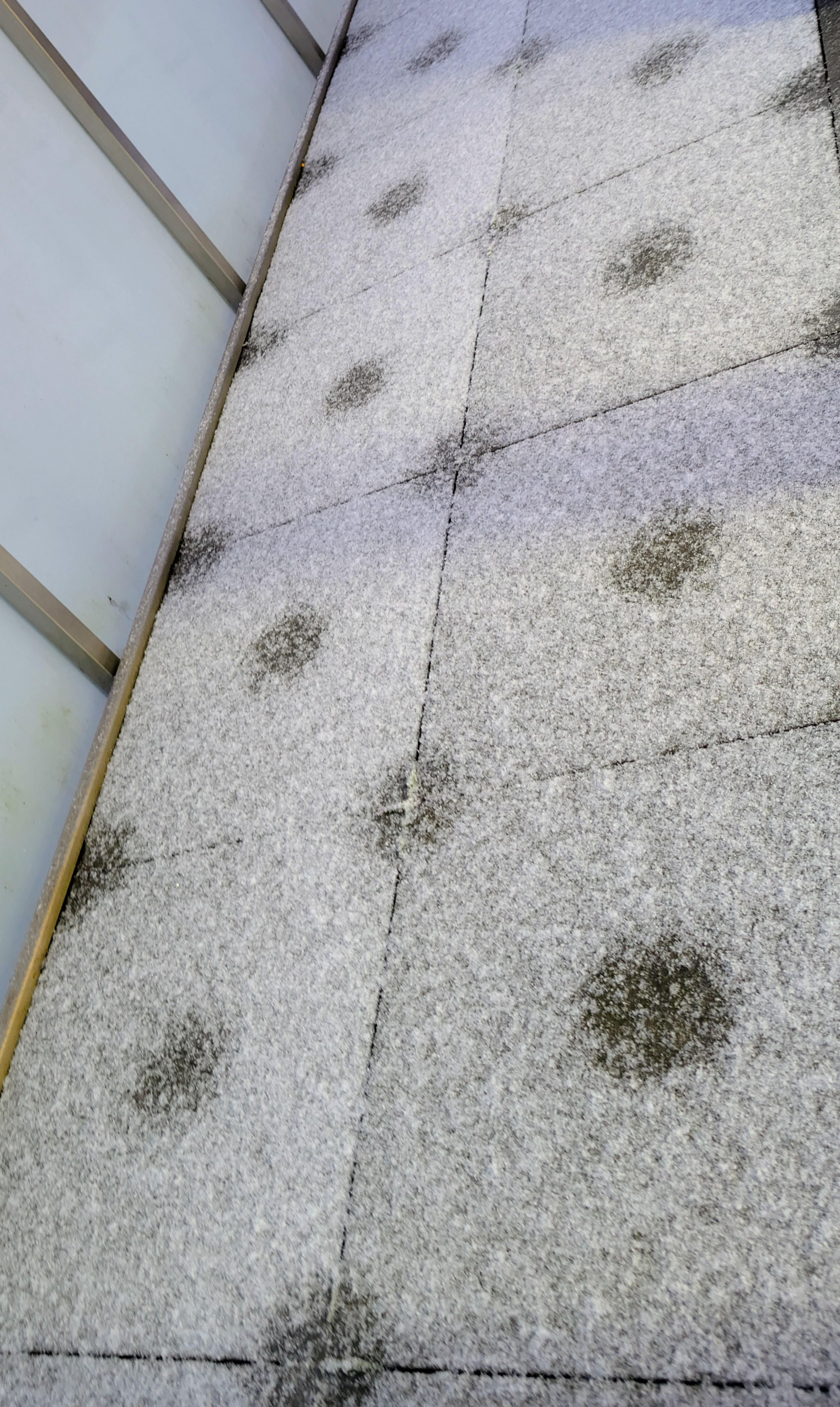 Floating tiles. There are small height ajustable plastic “poles” supporting the tiles. The spots are where these poles have contact with the tiles.