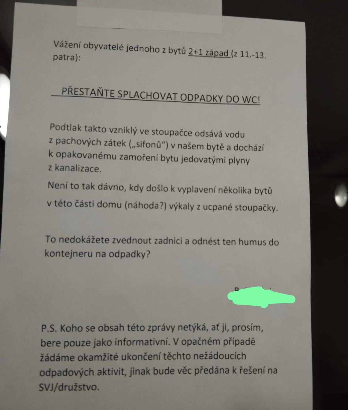 NJN debilní lidi. Týpek spláchnul kostru od kuřete nebo tak něco. Dole v přízemí nám to vyplavilo sračky.