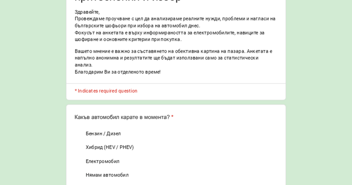 stiamo conducendo un breve sondaggio anonimo relativo a come le persone in Bulgaria percepiscono le auto elettriche e come prendono una decisione quando scelgono un’auto.