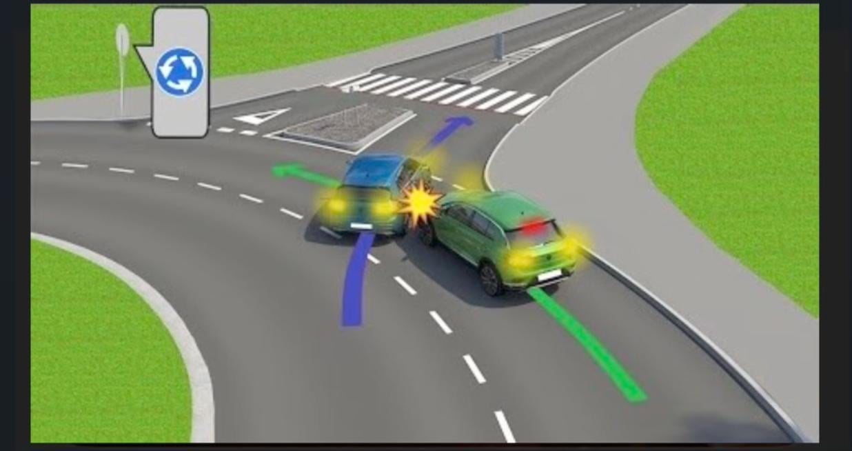 Blauw is in de fout, die had al op de buitenste rijstrook moeten rijden als die daar wou afslaan.