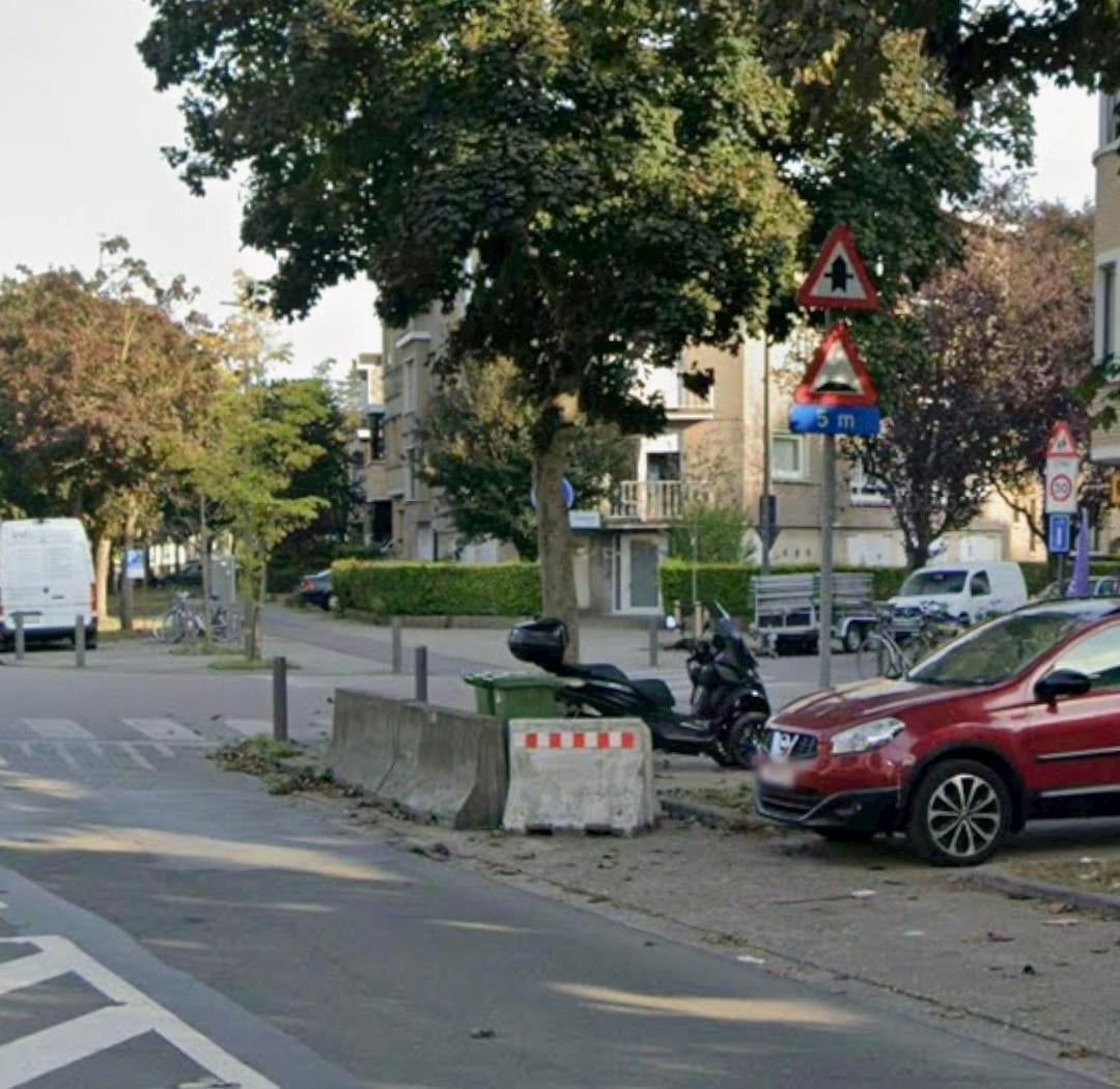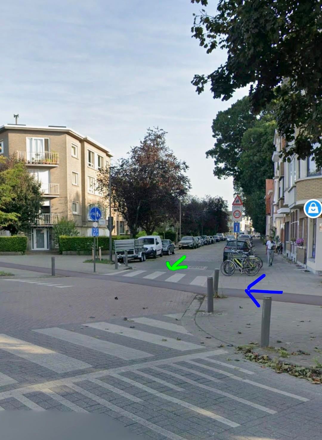 Questa è una di quelle tipiche situazioni di traffico confuse. Il blu è un ciclista sulla pista ciclabile. Verde un altro utente della strada. La pista ciclabile non è continua (nessuna linea bianca spezzata), ma la strada rosa è comunque estesa, il che crea molta confusione. Il verde ha la scacchiera B1. Le auto provenienti dalla direzione della freccia blu hanno il cartello B03 (ma questo è a sinistra della pista ciclabile). Quindi penserei che la freccia verde abbia la priorità?