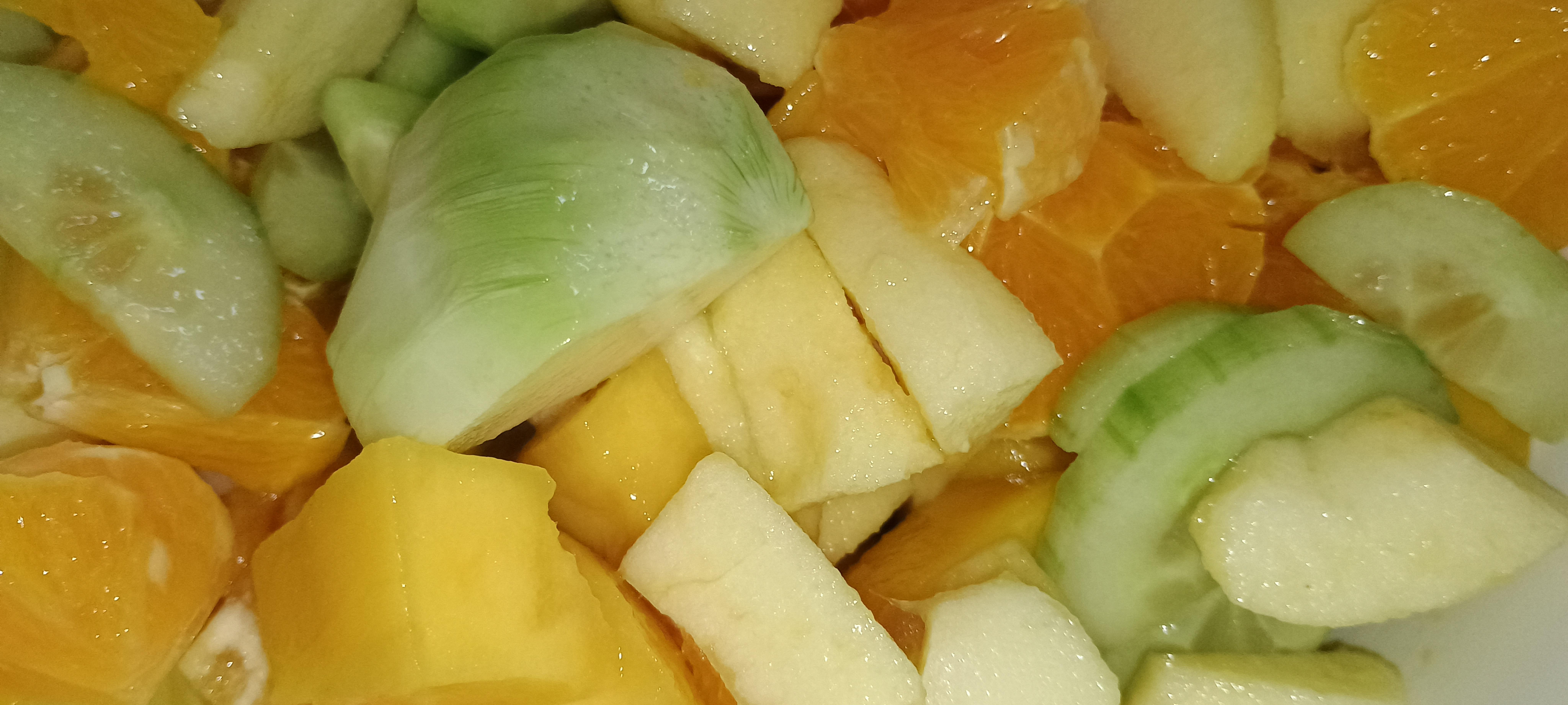 Insalata di cetrioli, cavolo bianco, arancia, mela, mango e succo di limone.