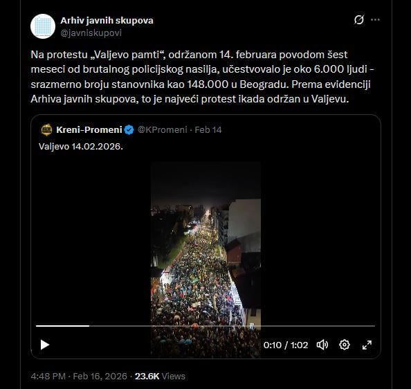 AJS: Protesta a Valjevo il 14 febbraio 2026. rappresenta la più grande protesta nella storia di questa città. https://i.redd.it/rhzlvveb20kg1.jpeg di Old_Passenger7