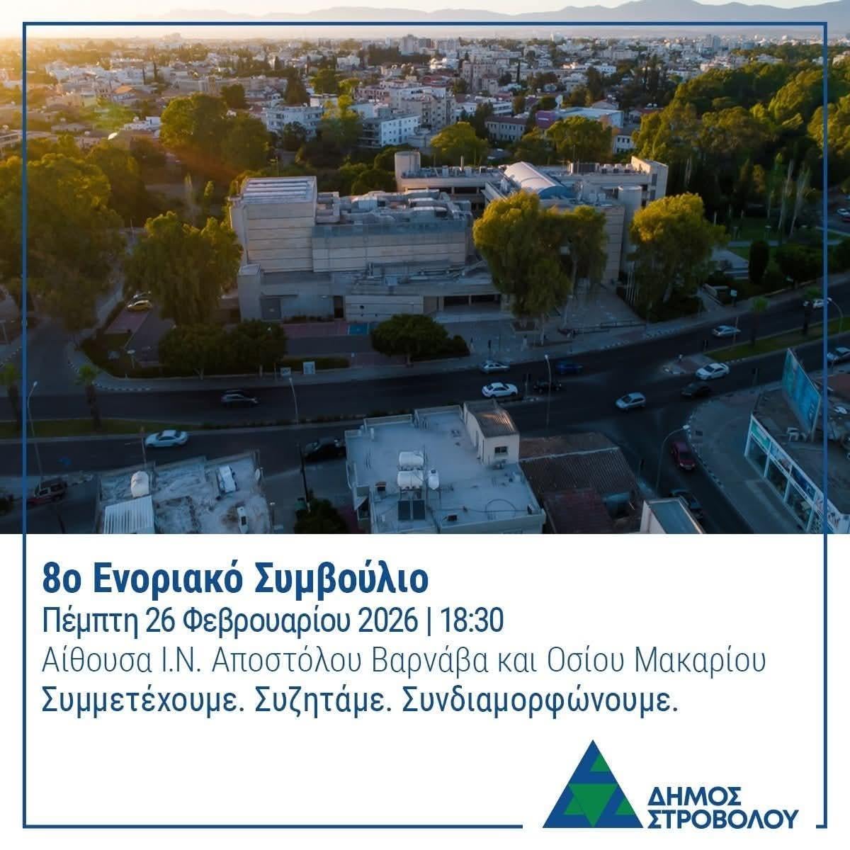 🟢 8° Consiglio Parrocchiale – DASOUPOLI 🤝 Strovolos sta cambiando. Insieme miglioriamo il nostro quartiere! Per il secondo anno consecutivo, il Comune di Strovolos organizza Consigli Parrocchiali, rafforzando il dialogo con i cittadini e la co-formazione di soluzioni per ciascun quartiere. 📅 Giovedì 26 febbraio 2026