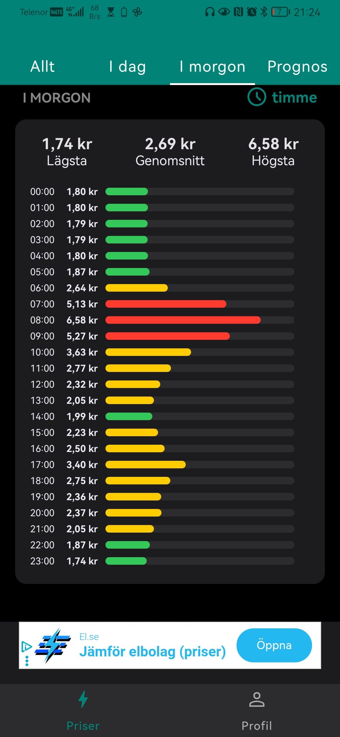 Själv kör man med fast pris på 84 öre /KWh i SE3.