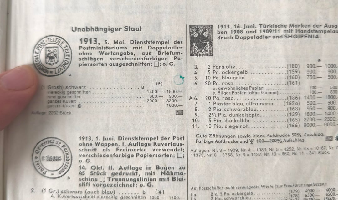 Il primo francobollo albanese era un pezzo di carta con sigillo, che ovviamente non ho (Foto 3). Si trattava solo di una soluzione temporanea, di un’improvvisazione, perché i veri francobolli (foto 1), ordinati dal Congresso albanese di Trieste, tenutosi dal 27 febbraio al 4 marzo 1913, dovevano arrivare in Albania in tempi relativamente brevi. Ma come spesso accade nella vita, quando qualcosa può andare storto, lo farà .