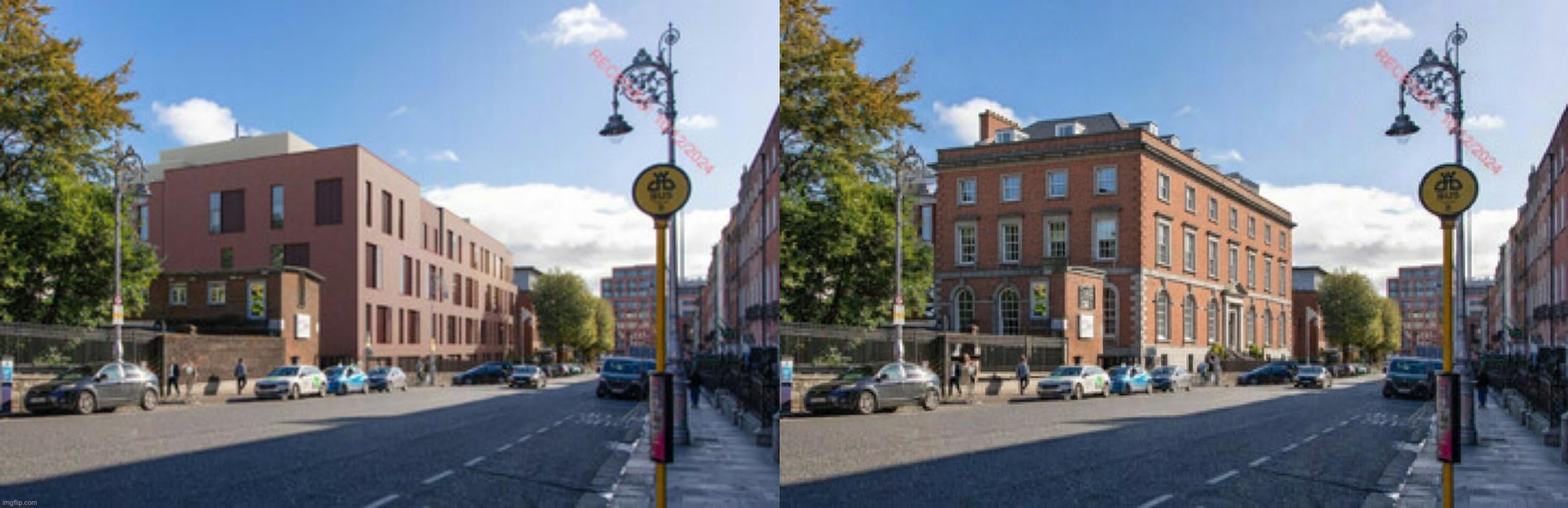 Possiamo discutere all’infinito se ciò valga come motivo per bloccare un aggiornamento di infrastrutture critiche come questo. La cosa però mi ha fatto riflettere: è praticamente universalmente riconosciuto che lo stile attualmente preferito da architetti e progettisti, raffigurato a sinistra (proposta reale per la nuova unità) è assolutamente *disprezzato* dal pubblico in generale. La stessa controversia sta attualmente influenzando la riqualificazione di Stephen’s Green e ha causato polemiche più o meno per ogni grande sviluppo che ricordo negli ultimi due decenni. La forma poligonale con una blanda muratura esterna e la disposizione asimmetrica delle finestre dalla forma strana è solo uno stile che il pubblico trova fondamentalmente brutto. Eppure è *ovunque*. Direi che questo stile, insieme a quella che io chiamo la “torre oscura”, che consiste in finestre verdastre di colore scuro e una struttura in acciaio nero, domina assolutamente l’architettura irlandese ogni volta che viene proposto qualcosa di nuovo. Il problema è che la gente *lo* odia. Praticamente universalmente, questi due stili sono assolutamente considerati brutti pugno nell’occhio che stanno distruggendo il carattere della città in cui vengono costruiti, e rispetto agli stili più vecchi.