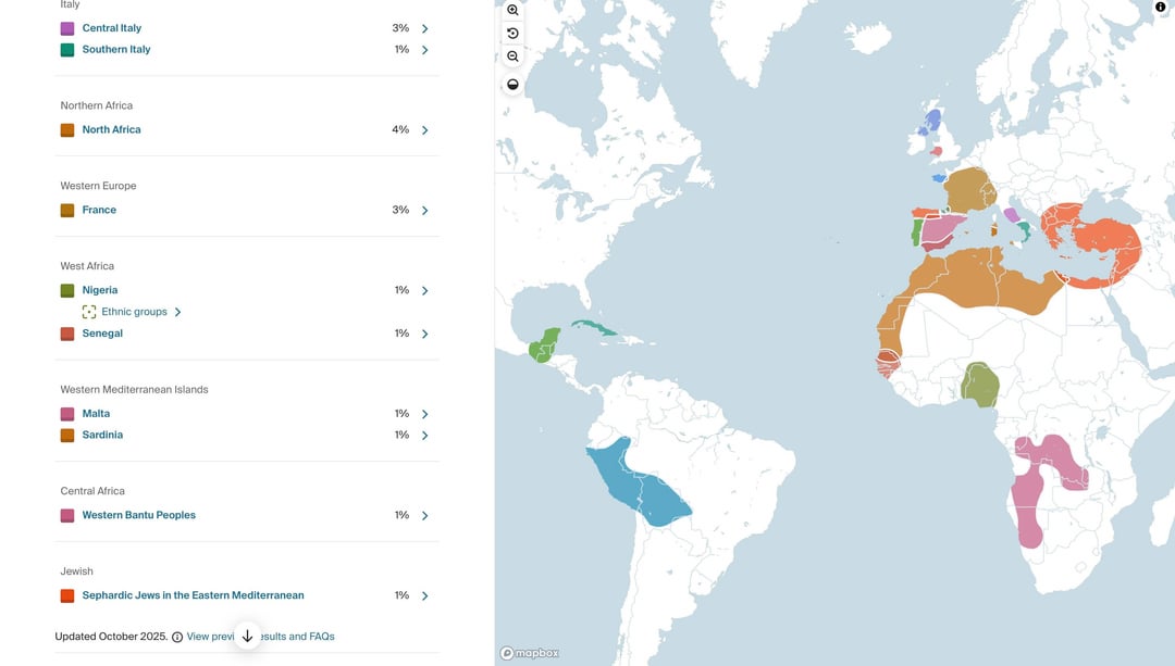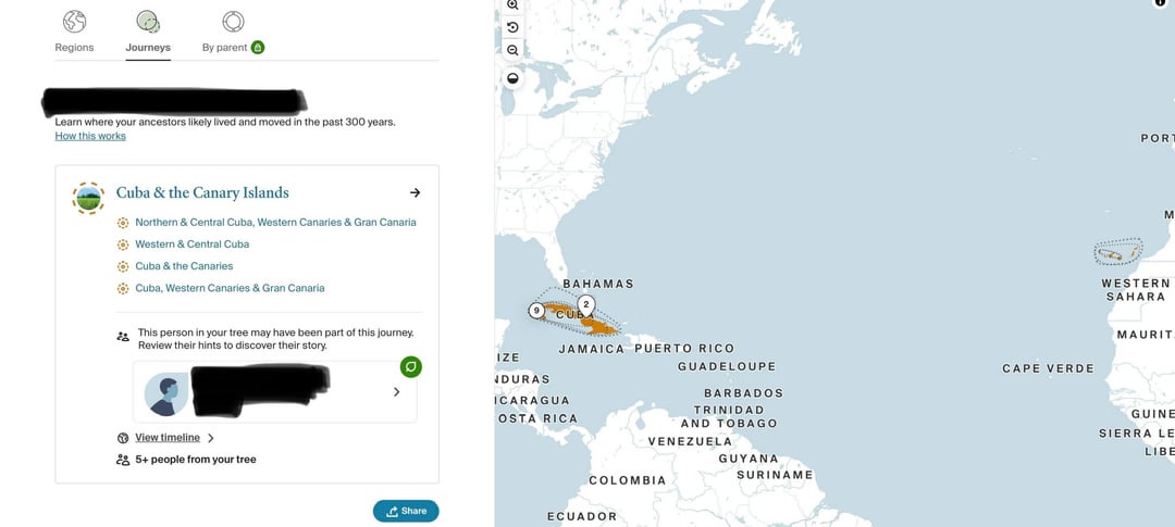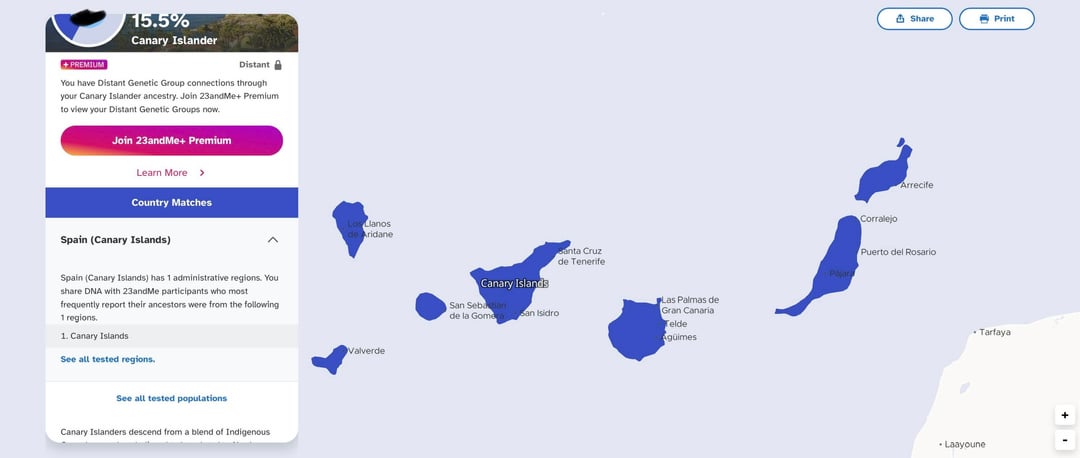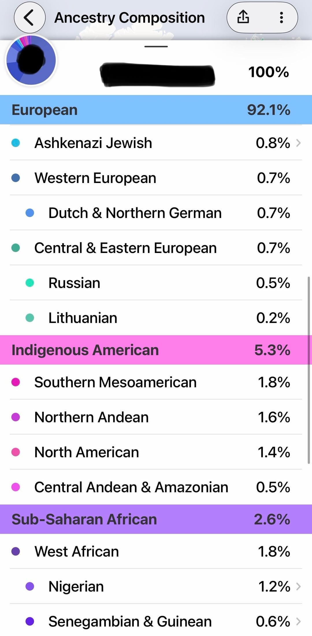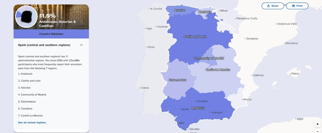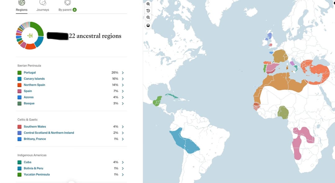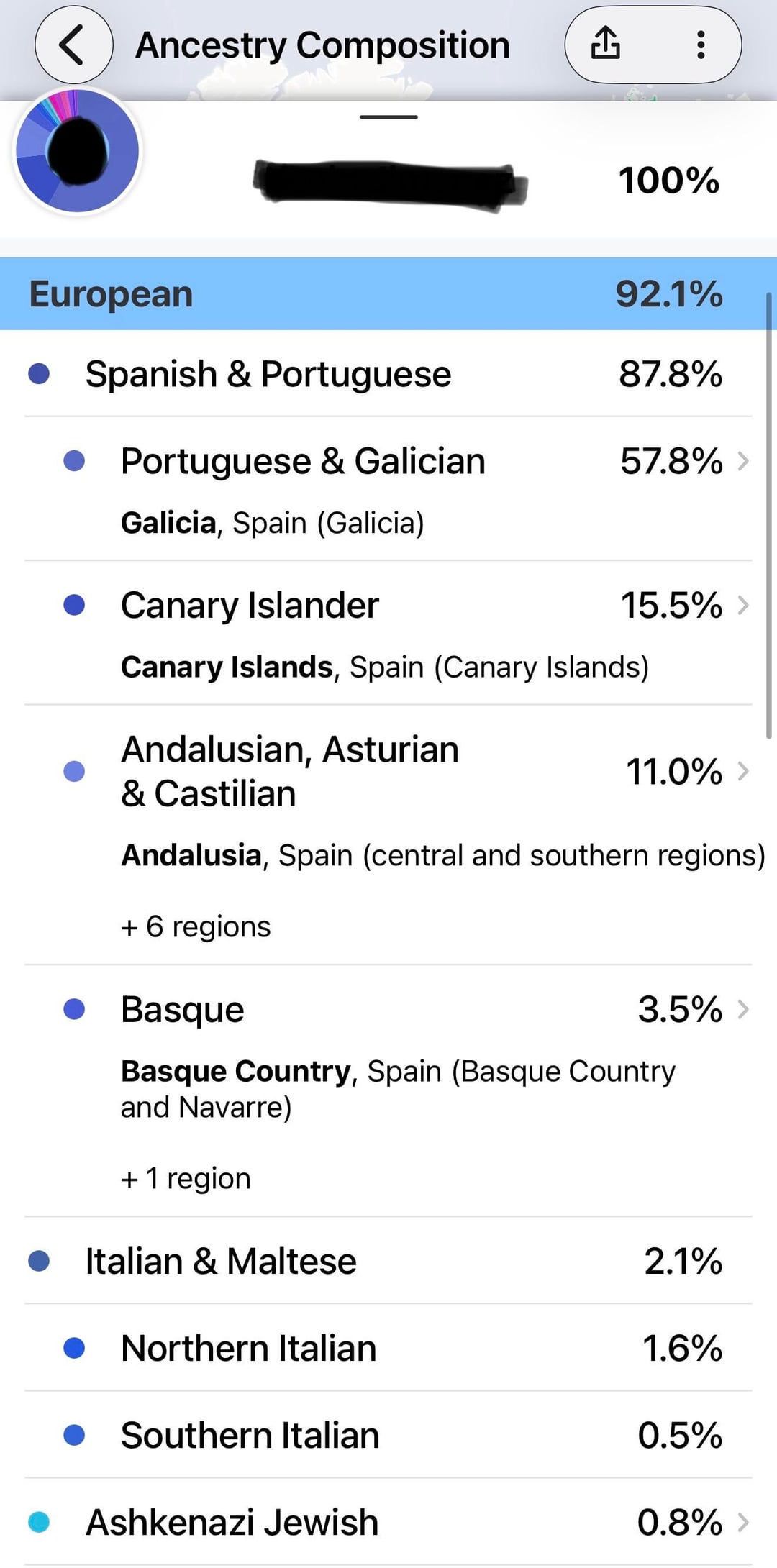 Ho sempre saputo che avevamo origini spagnole, ma non mi aspettavo che le percentuali piΓΉ alte nei miei risultati fossero galiziane e portoghesi. Lo trovo molto interessante, soprattutto perchΓ© non ho antenati galiziani o portoghesi e nessuno dei miei cognomi Γ¨ chiaramente galiziano o portoghese. Alcuni si trovano anche in Galizia, ma non sono esclusivi di quella regione. La maggior parte dei cognomi che ho ricercato risalgono principalmente ad altre parti della Spagna.