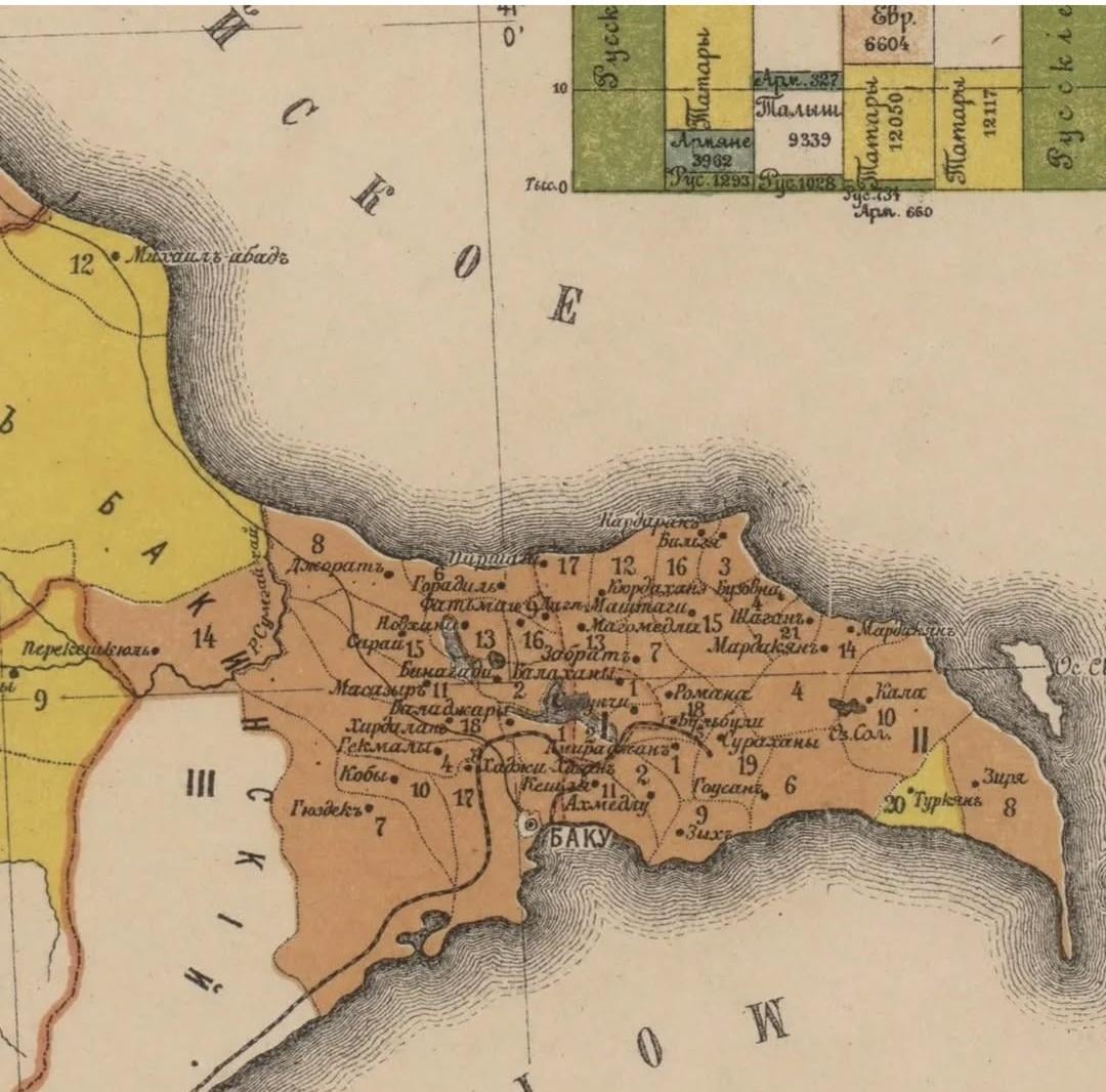 Mappa etnografica di Baku del 1886, solo Türkan ha una popolazione a maggioranza tartara (turca) https://i.redd.it/92w3ukglgkkg1.jpeg di TurbulentBrain540