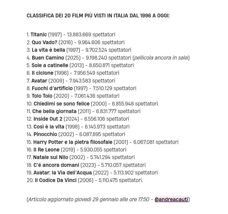 1. Link all’interessante articolo, anche se con un titolo abbastanza idiota: [https://www.agi.it/spettacolo/news/2026-01-26/checco-zalone-classifica-spettatori-incassi-35287578/](https://www.agi.it/spettacolo/news/2026-01-26/checco-zalone-classifica-spettatori-incassi-35287578/)