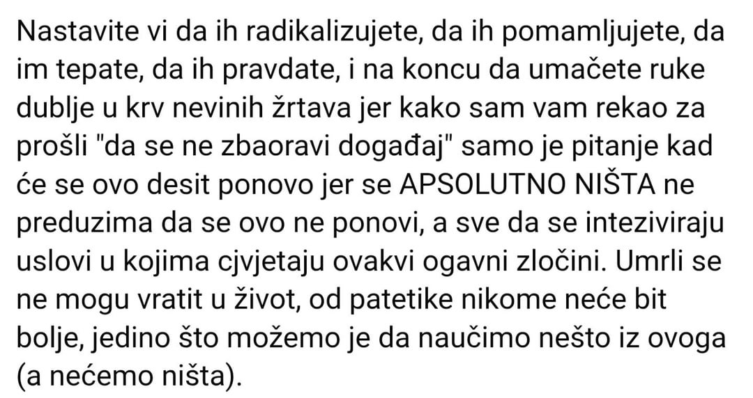 truthsalmon1 on 20/02/2026 22:07 OP je juce napravio account i odmah je u nekoliko postova isplivala mrznja i zloba prema Crnogorcima. Stari debilar je ovo okacio isto vece drugog masakra. Stvarno poremećen covjek. Koliko se cetnika sladilo nad ubijenom djecom dosta govori o kakvim se ljudima radi.
