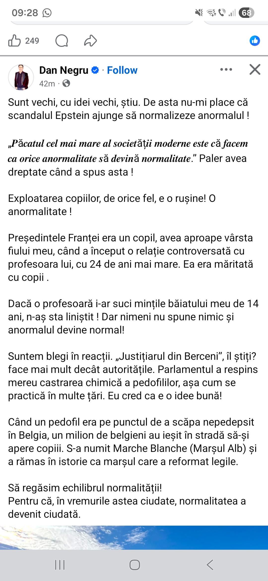 Asta e frate. Macron era minor cand si-a cunoscut viitoarea sotie trebuie aratat cu degetul (chiar daca el era minorul in acea relatie). Trump si alti lideri ai lumii sunt implicati intr-un scandal in care ei sunt presupusii pedofili, hai sa nu zicem nimic de astia. Apoi il dam exemplu pe justitiarul din berceni. Danutul a coborat stacheta mai mult decat in alte postari.