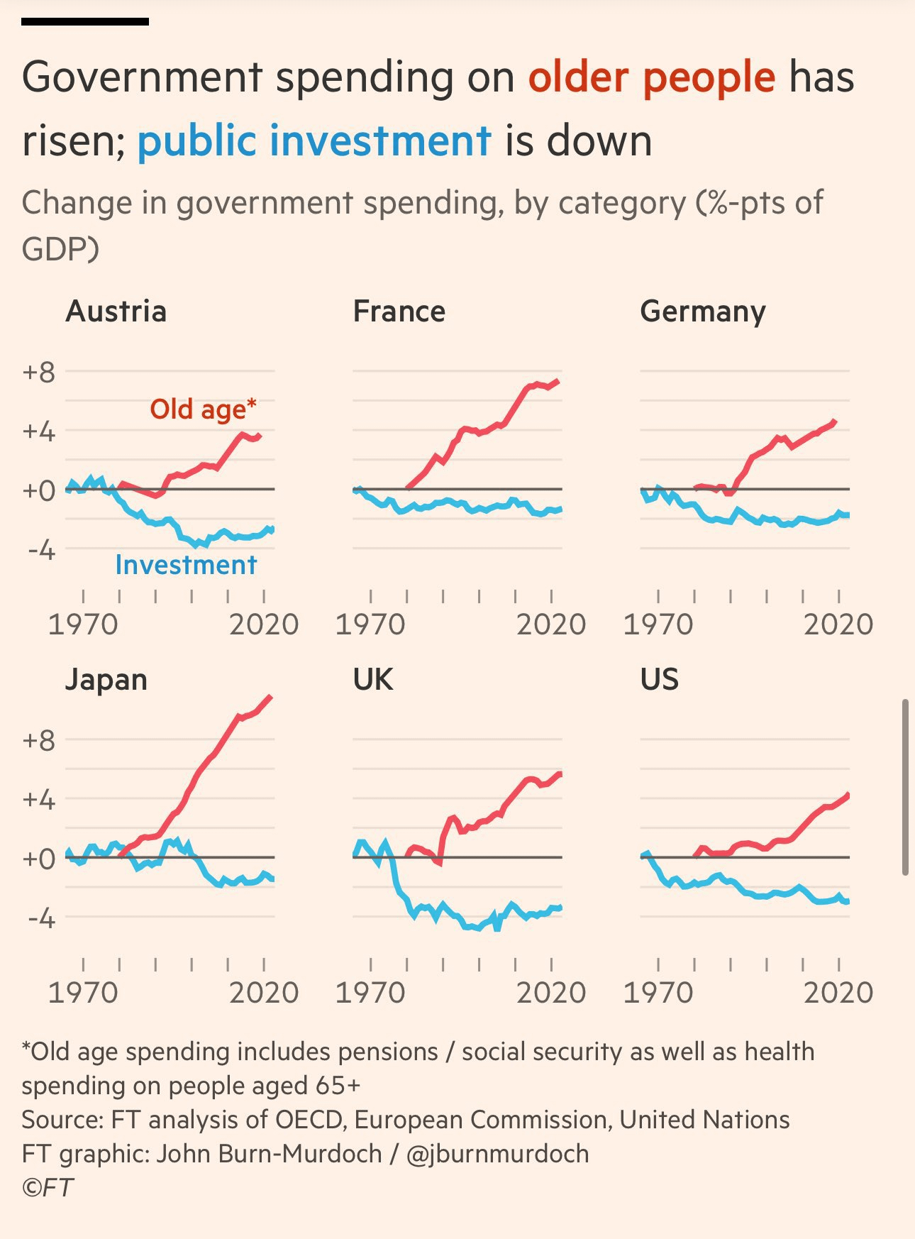 Kann es nicht daran einfach liegen, dass der Allgemeinwohlstand und Altenpflege seit den 70ern einfach gewachsen ist und das Public Investment in der Nachkriegszeit einfach auf einem absurd hohen Stand war