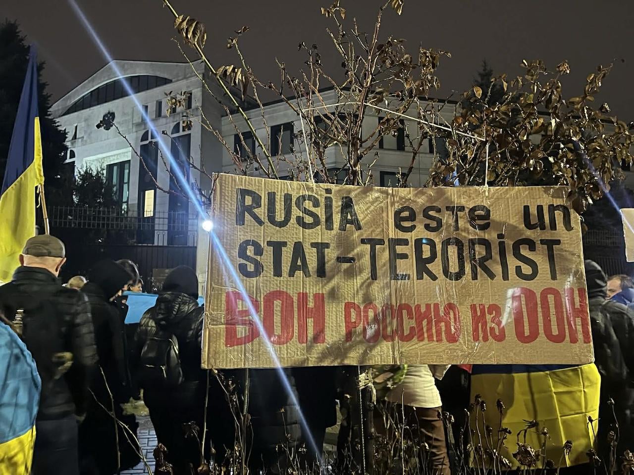 Protesta davanti all’ambasciata russa a Chisinau nel giorno che segna i quattro anni di guerra in Ucraina. La gente canta: “Putin criminale” e “Slava ZSU”