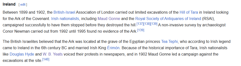 Apparentemente Maud Gonne ha impedito all’Associazione britannico-israeliana di cercare l’Arca dell’Alleanza presso la tomba di una principessa egiziana sulla collina di Tara