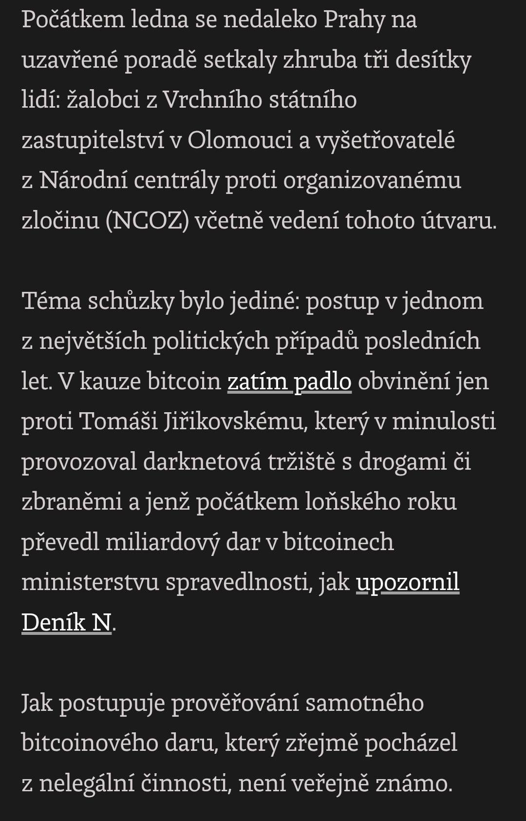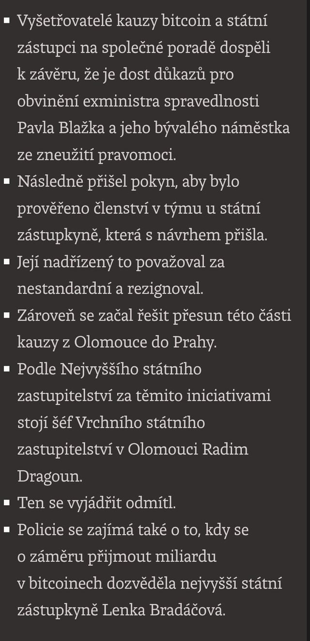 Gli investigatori del caso Bitcoin concordano: abbiamo prove sufficienti per perseguire Blazek. Poi è arrivata la ristrutturazione decisamente insolita della squadra sotto la guida della rappresentante senior Bradáčová (è stata sostituita da Blažek). Nella nuova squadra non c’è posto per chi voleva inseguire Blažek.
