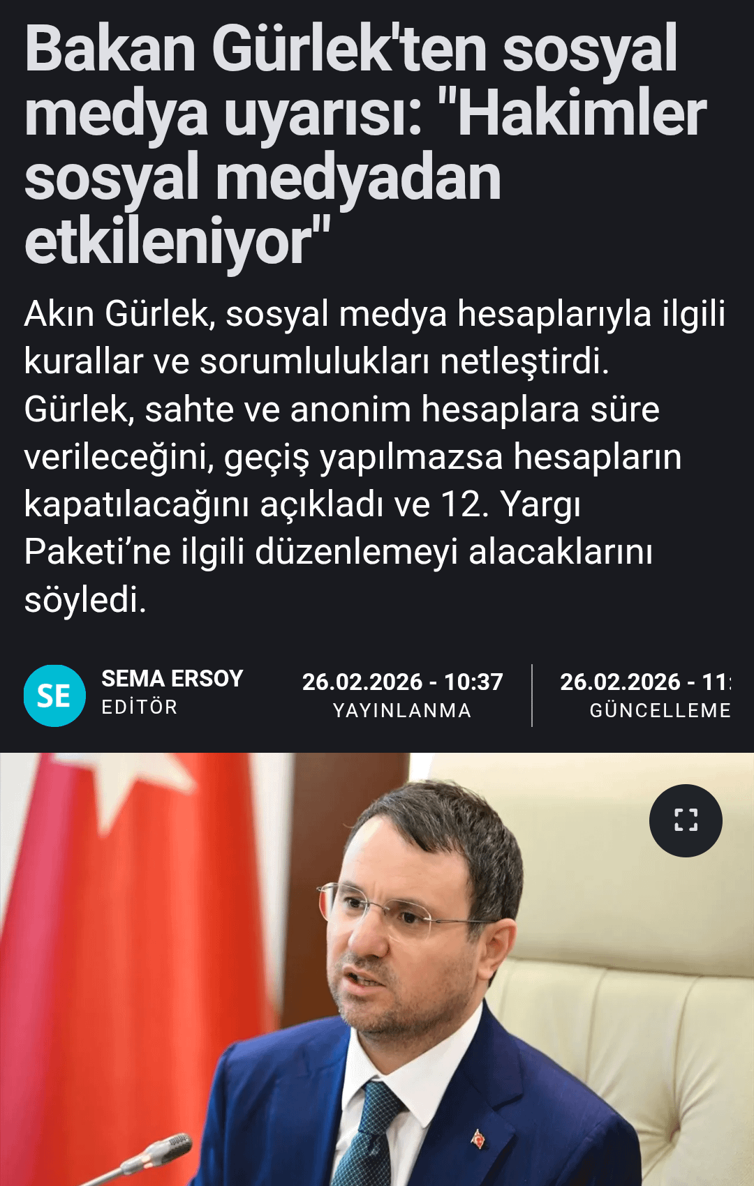 "I social media non sono sicuramente un luogo di libertà, dovrebbero avere delle regole." Il Ministro della Giustizia Gürlek ha dichiarato: “Ci sono conti anonimi sui social media. Non dovrebbero essere aperti conti falsi. Il nostro Ministero della Famiglia e dei Servizi Sociali si occupa di persone di età superiore ai 15 anni. Se una persona apre un conto, deve assumersene la responsabilità. Daremo tempo agli account utilizzati in modo anonimo. Ad esempio, diremo o passate a un conto reale entro 4 mesi altrimenti il vostro conto verrà chiuso.” ha detto.