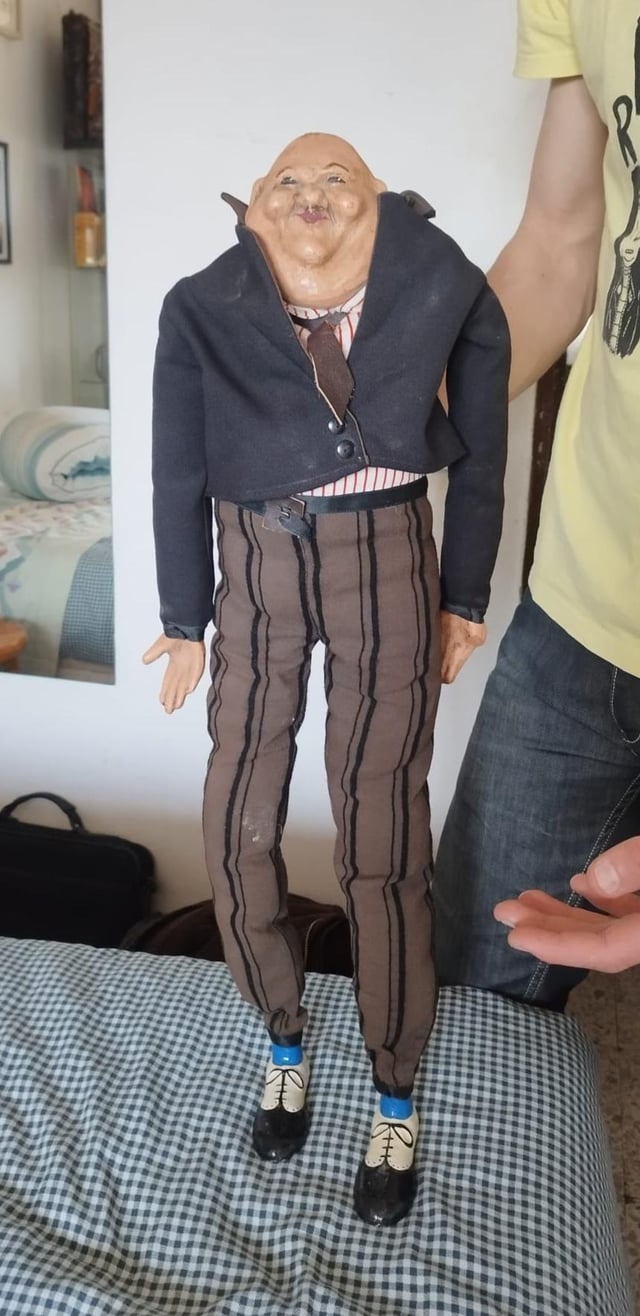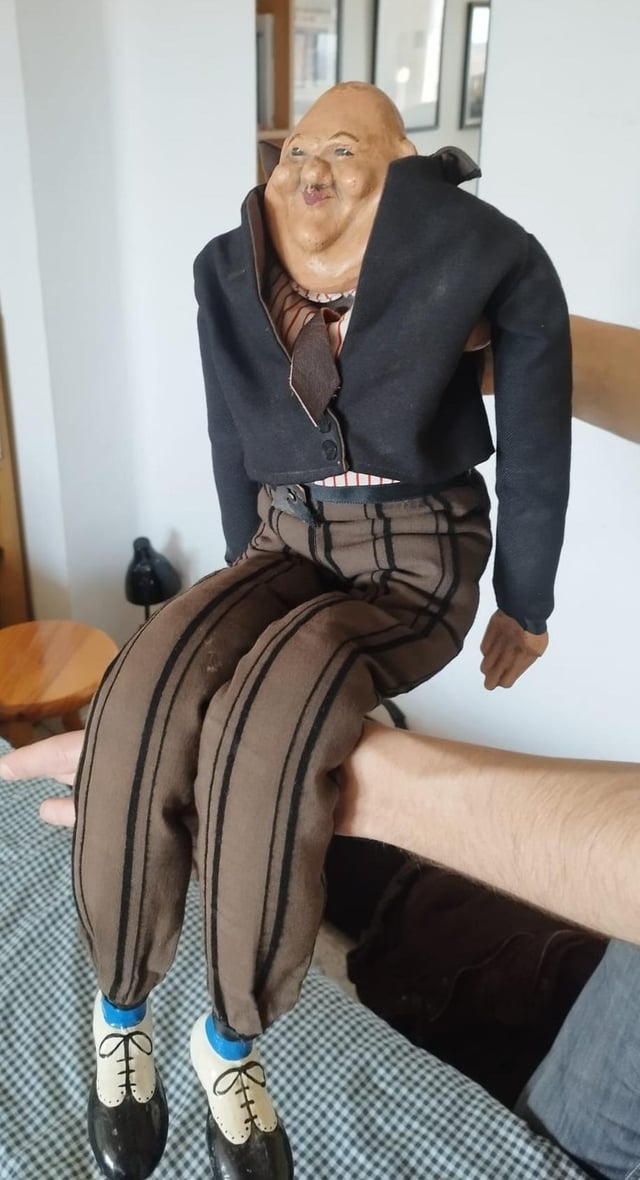 Ciao! Qualche giorno fa ho trovato questa bambola in un negozio. Qualcuno saprebbe indovinare di che epoca è? Penso che sia Oliver Hardy. Ha un po’ di pelo ma si è staccato. L’interno è imbottito in cotone, tutto in buone condizioni. Testa, mani e piedi sono realizzati in materiale ceramico, il resto è in tessuto. Grazie!!