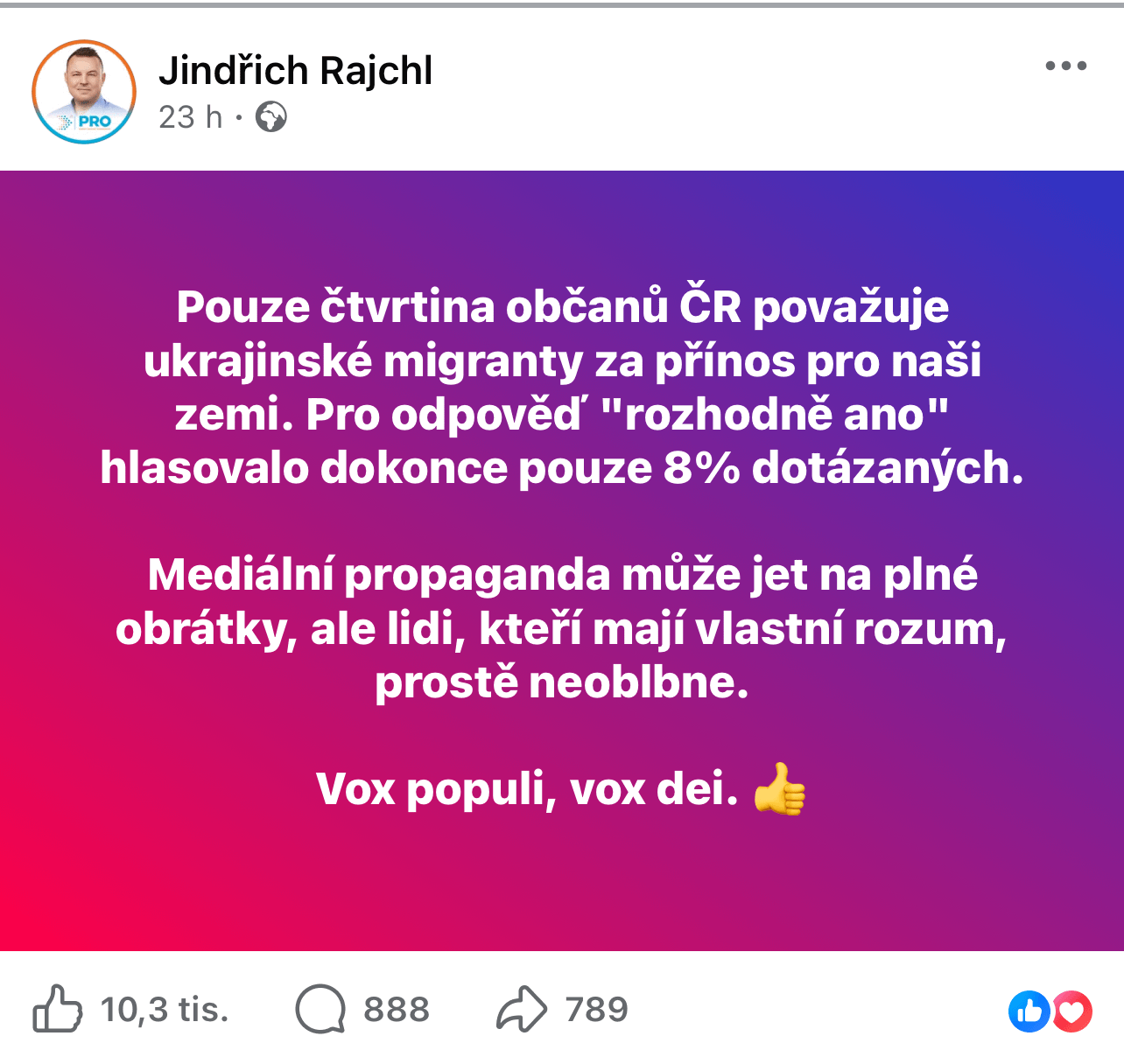 Možná by bylo fajn připomenout to, že ti Ukrajinci co tu přišli, tak i vydělávají důchodcům na to jejich neustále zvyšování důchodů. To jen tak, kdyby to voličům Rajchla náhodou nedošlo.