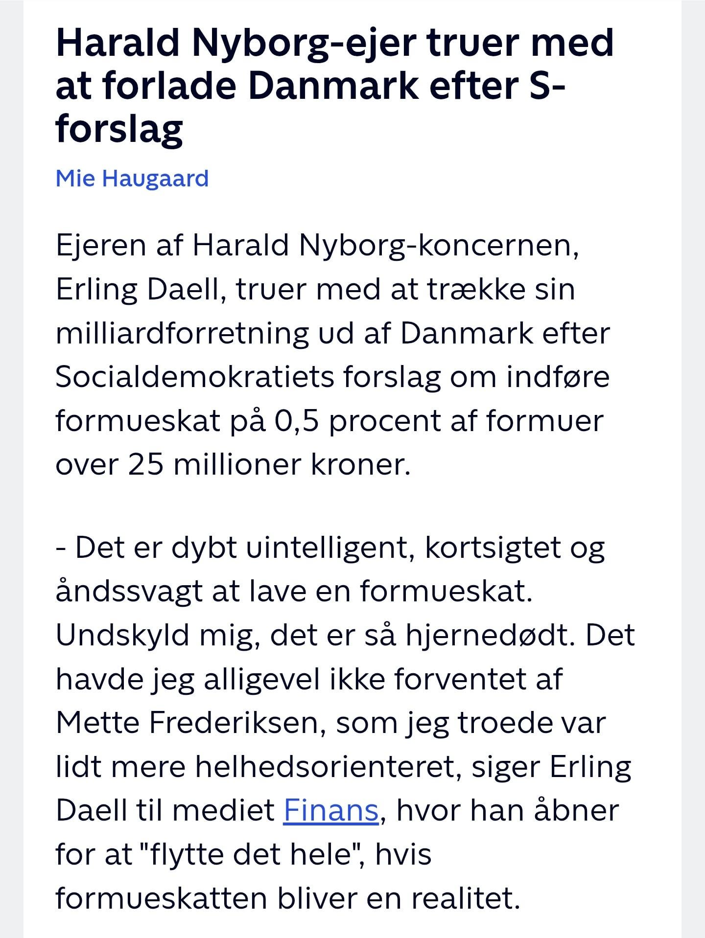 Jeg har aldrig fattet argumentet om at “så flytter de rige ud”. 1) nej de gør ikke, meget få af dem vil rive hele deres liv op med rodene pga 0,5% over 25 millioner. 2) ok? Ud med folk der ikke ønsker at bidrage til samfundet.