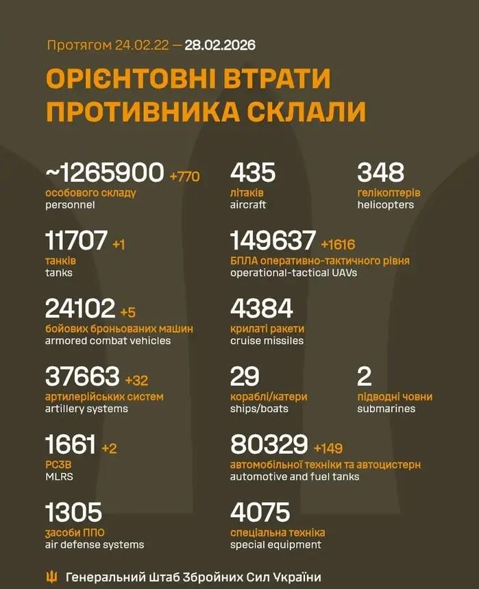 Shopro on 28/02/2026 05:54 [Daily stats](https://www.reddit.com/r/RussianLosses/comments/1rgueh4/estimated_russian_losses_from_24022022_to/)