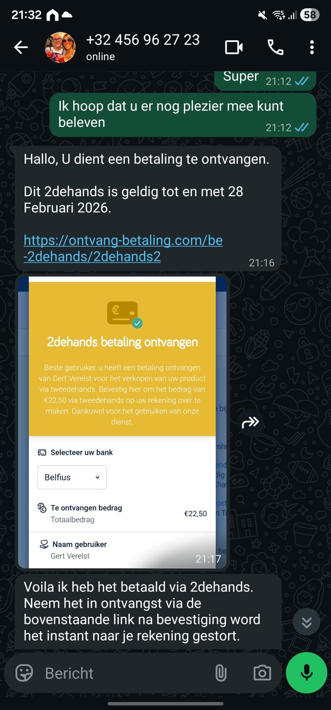Tweede tip: houd de discussie in de chat op 2dehands ipv naar WhatsApp te verhuizen, dat is een bewuste tactic omdat de tools van 2dehands die fraude detecteren dan niet meer werken.
