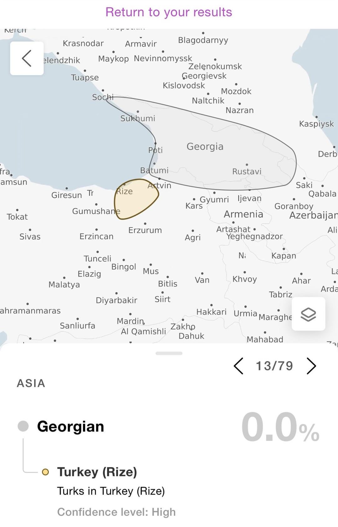 Ehi ragazzi! Ho fatto un test del DNA e sono un po’ confuso sui risultati. Apparentemente i miei discendenti provengono da Rize, Turchia, ma è elencato sotto "georgiano" pur avendo allo stesso tempo lo 0% di georgiano. Qualcuno può spiegare come ciò sia possibile?