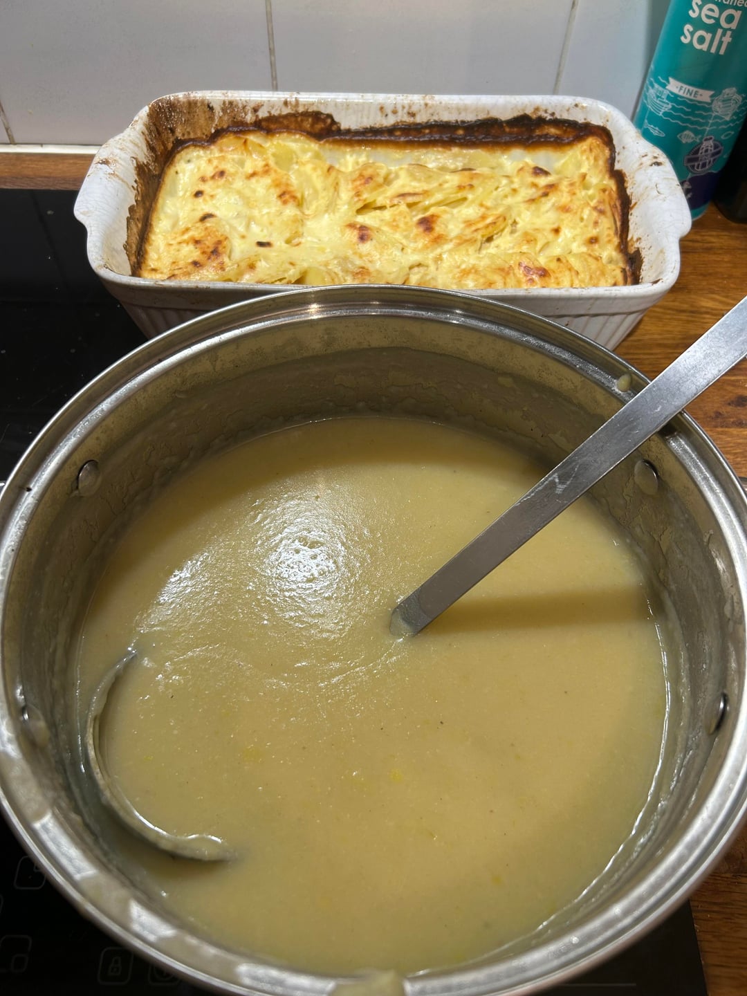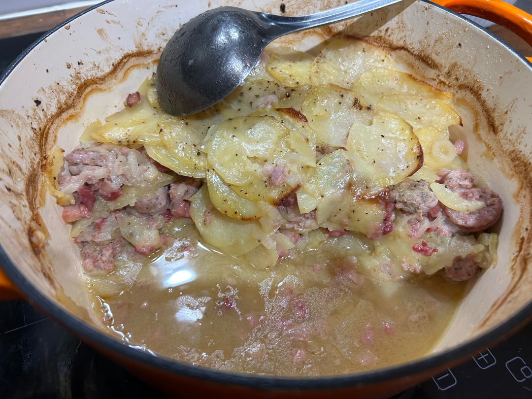 Il mio unico errore secondo me è stato che mi piaceva questo stile, quindi ho optato per le patate tagliate alla mandolina, ma poiché avevo così tante salsicce e pancetta (900 gr + 600 gr), non potevo fare un altro strato. ma avrei dovuto semplicemente raddoppiare ogni strato di patate. comunque, comunque fantastico per un primo tentativo.