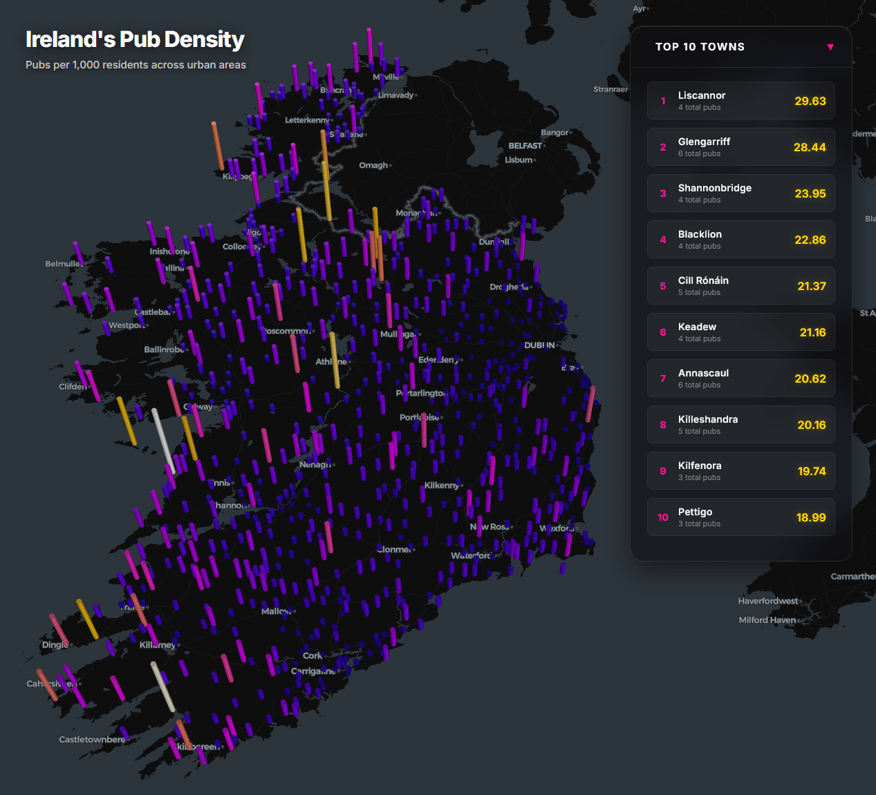 And as much as I love a “dark mode” still visual, the dark blue towns get lost here. Make the map an off-white / matted grey and switch the top value of the colour key – which is currently white for Liscannor – to red. That’s more intuitive and would provide greater contrast.