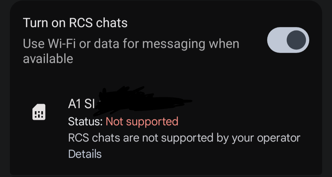 2. Noben operater pri nas ne podpira RCS. Prej je delovalo prek Googlovih strežnikov ampak je Google zadevo izklopil in zdaj je na operaterjih, da implementirajo ampak očitno nimajo interesa. Smo pač ostali pri SMS in MMS, kot da smo v letu 2003.