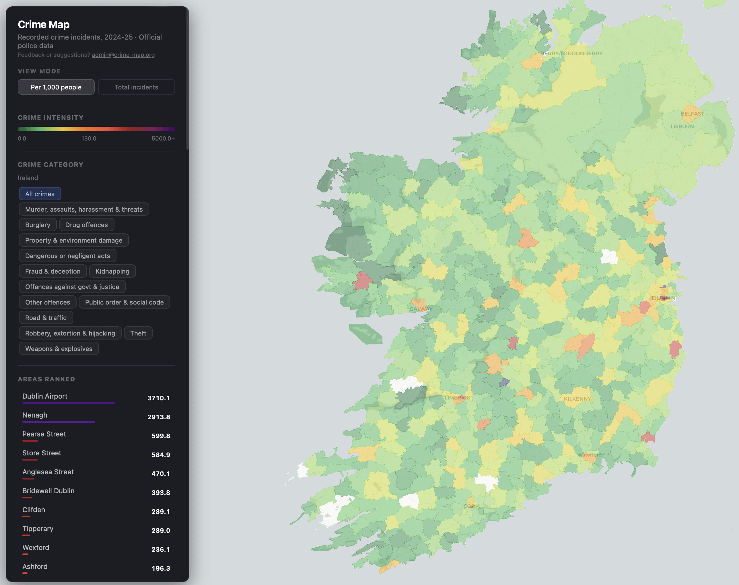 These are the Garda station locations and not indicative of the crime of the area in question. For example, Ashford Garda station covers a very wide area