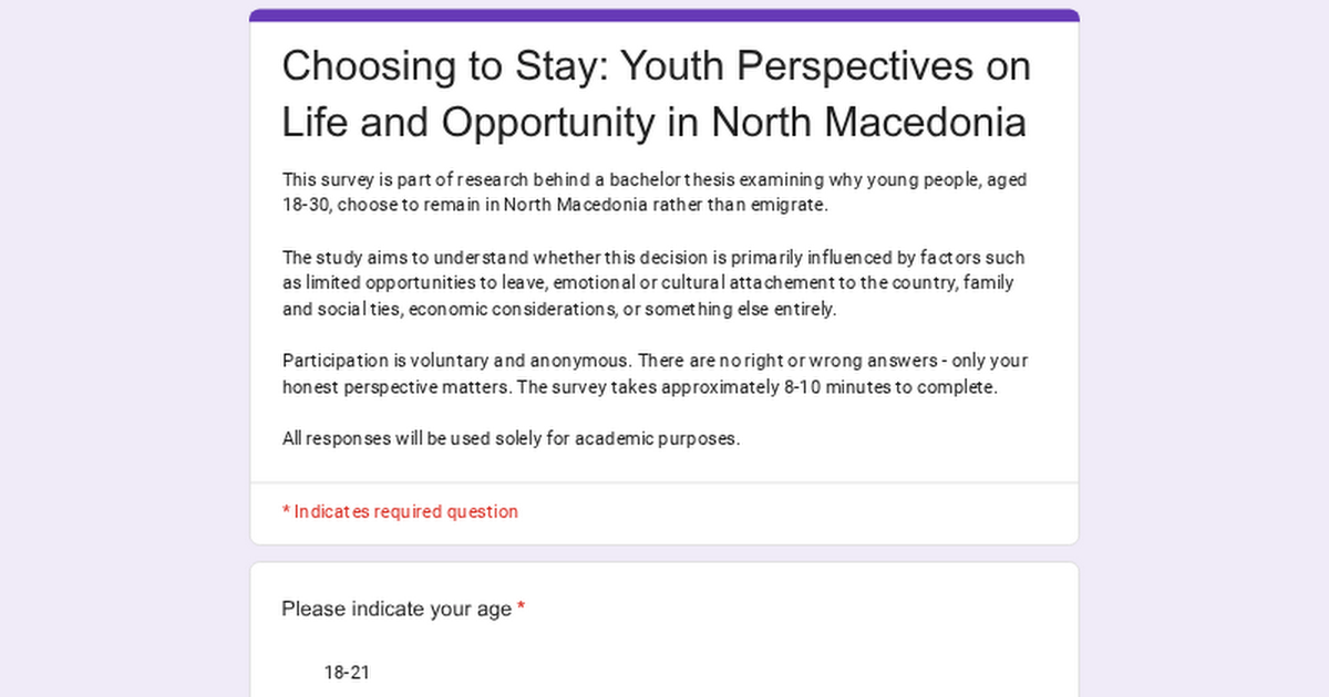 Il sondaggio riguarda il tuo punto di vista sulla permanenza nel paese rispetto all’emigrazione, nonché la tua opinione sulle opportunità in Macedonia rispetto all’estero.