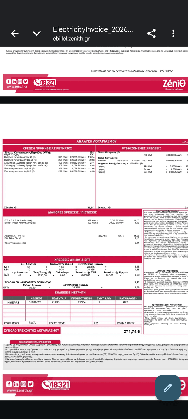 Έχεις καταναλώσει 692 KWh δεν γίνεται ενώ λες δεν καις τίποτα…την ίδια περίοδο πέρυσι σου λέει 222KWh…470 διαφορά είναι πολύ, πάρα πολύ!