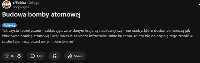 Najciężej bez zauważenia jest zdobyć materiał rozszczepialny. Jak już masz ogromne ilości najpewniej uranu to trzeba zbudować ogromną placówkę która z tej góry metalu odseparuje 0.7% materiału rozszczepialnego i zbierze dostatecznie duże stężenie na zbudowanie bomby. Potem reszta głowicy to już sprawa względnie prosta tylko trzeba to zachować w ciszy, a rakiety co potencjalnie mogłyby taką bombę wynieść ITWL właściwie już buduje. Tylko trzeba zamienić nalepkę z “ładunek naukowy” na “broń masowej zagłady” żeby się ino nie pomylić. Jakby od owsiaka kupić uran to byśmy mieli atomówkę do końca roku, ale owsiak by się pewnie wygadał.