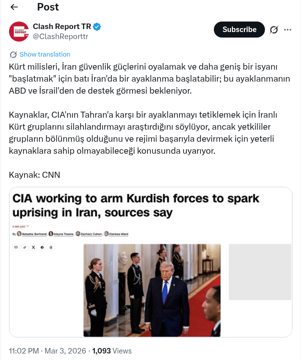 >Iran has not waited passively. It has been bombing Kurdish rebel positions in Northern Iraq, and Kataib Hezbollah has explicitly threatened the Kurdistan Region of Iraq against hosting “hostile foreign forces”. Iran’s IRGC intercepted Kurdish fighters attempting border crossings earlier, with Turkish intelligence providing advance warning of the movement. The operational surprise that is essential to such an infiltration strategy appears already partially compromised.