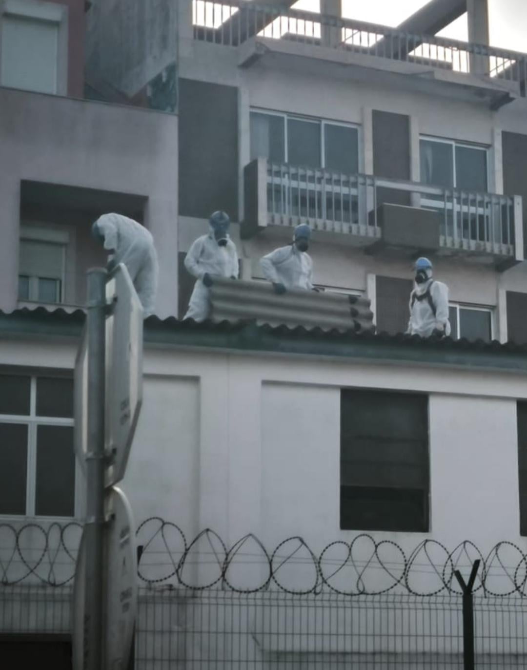 Deixas as janelas fechadas e pronto. O risco de contaminação é baixíssimo, até porque visivelmente se conclui que estão a ter todos os cuidados. Com certeza que terão realizados ensaios antes da remoção das placas e durante, para determinar a concentração de partículas no ar. Não vai ser isso que vai provocar o teu falecimento, OP. Podes estar descansado.