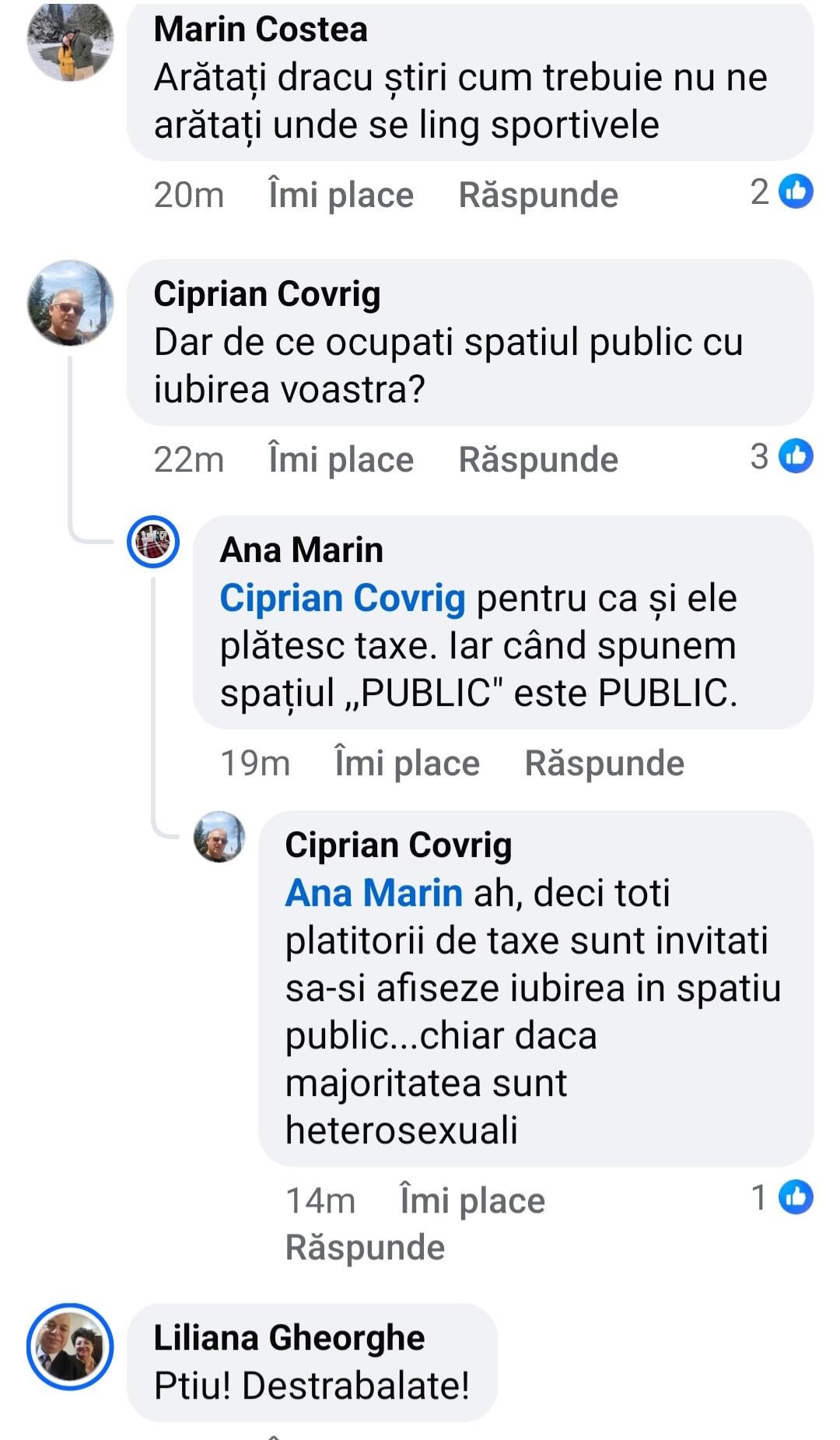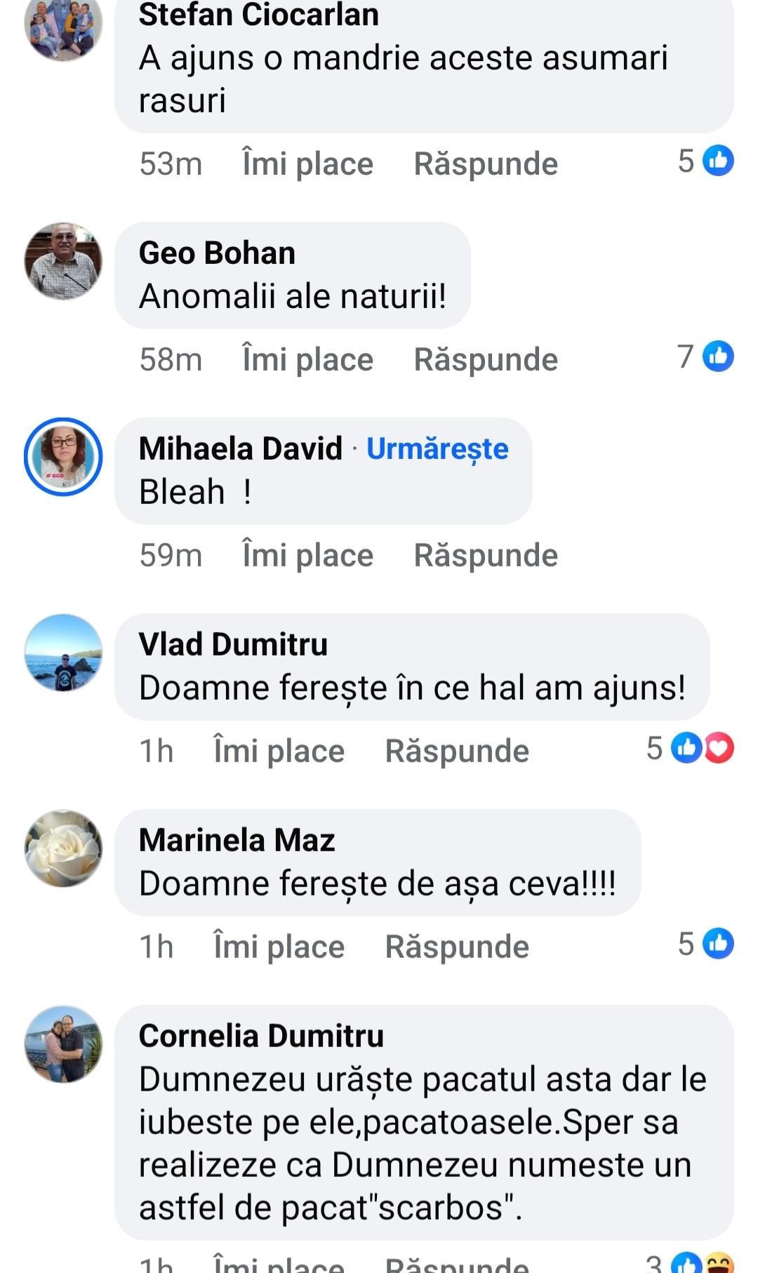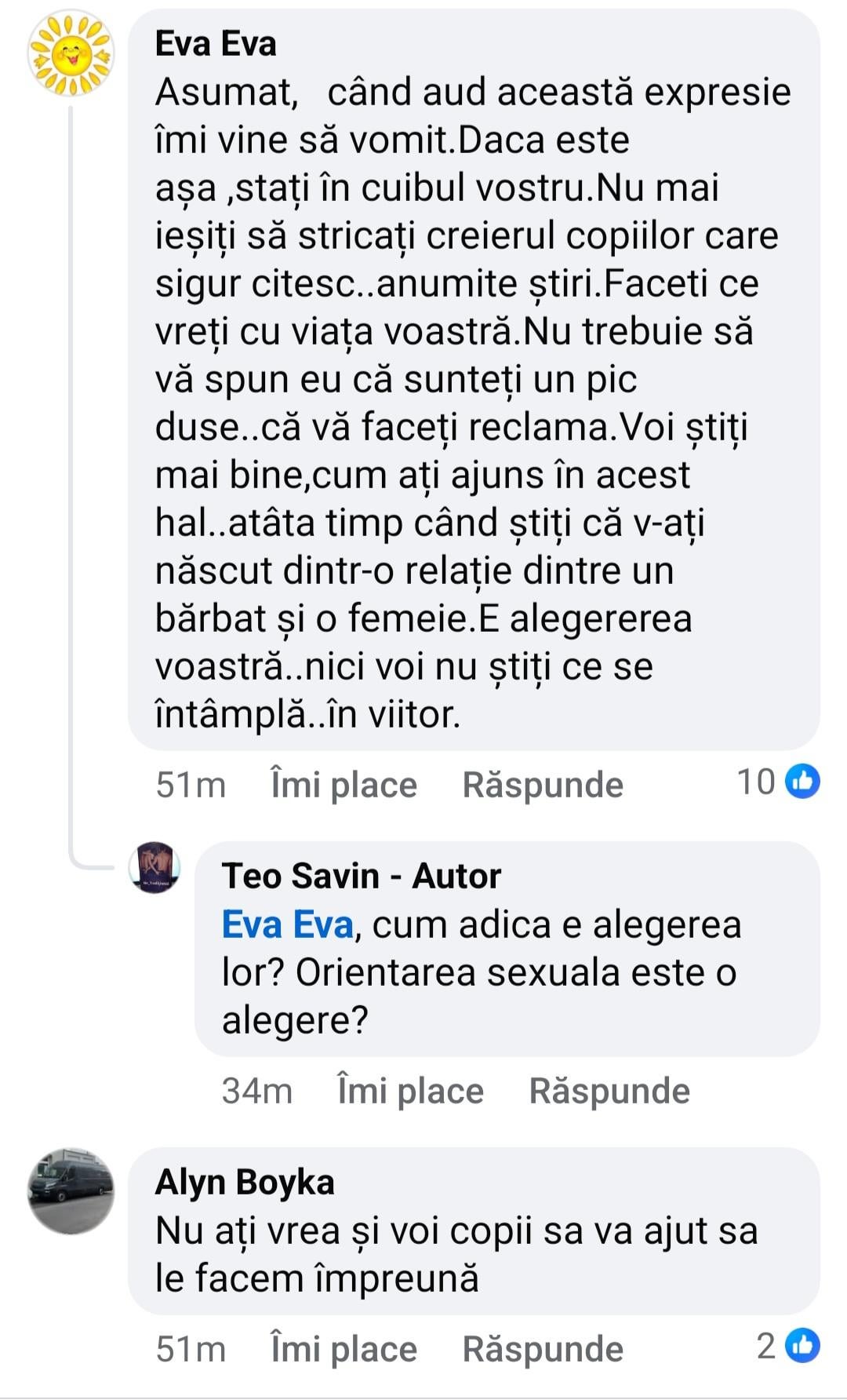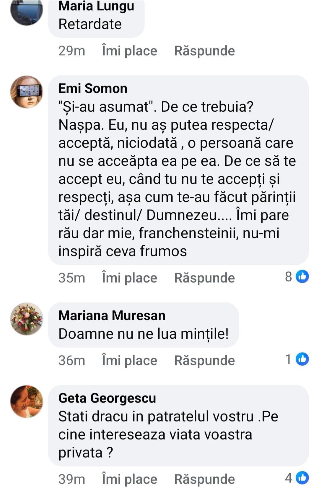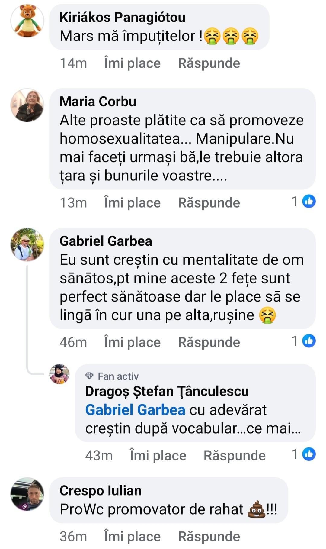 personal ma doare fix n pantof ce fac alti doi oameni in pat pe timpul lor, dar, cand tu personal arunci rahaturi din astea in spatiul public pentru validare si in special neavand prea mult creier sa intelegi ca provoci, orice specie poate spune absolut orice. Ce nu pricepe specia umana in general si mioritica in special de obicei, este ca in spatiul public este al tuturor, si cel mai normal lucru si foarte logic este sa reactionezi si sa ai o parere diferita. Nu vrei sa te injure lumea? stai in banca ta si vezi ti de viata …repet, pe toata planetao doare fix n pantof ce fac tanti astea n patul lor, dar daca vi si mi o arunci in fata atunci