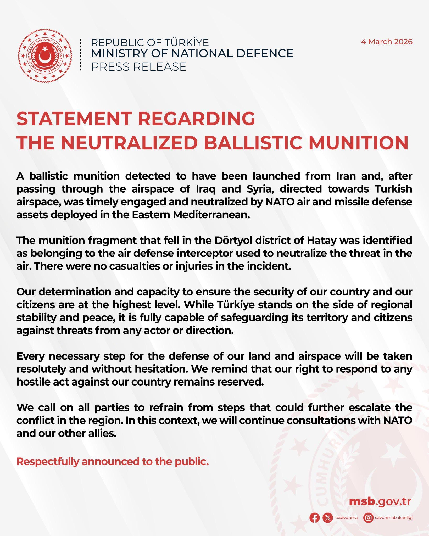 Comunicato stampa turco sulle munizioni balistiche iraniane dirette contro di esso.