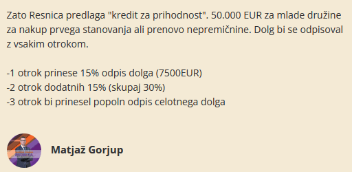 Pustimo da te en otrok do 18. leta v povprecju stane 120-200.000€. Teh 50k mi bo pa rec mocno pomagalo kupiti stanovanje, sploh kjerkoli v osrednjeslovenski regiji kjer das 250k za 50m2 stanovanja v 50 let starem bloku, kjer bos na koncu z obnovo vred dal banki ~500.000€ da odplacas ta puf. Hvala Resnica, baš ste zlati