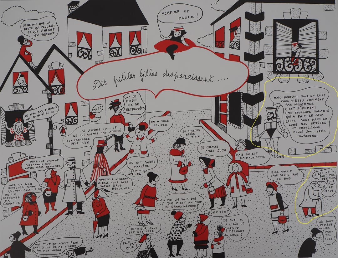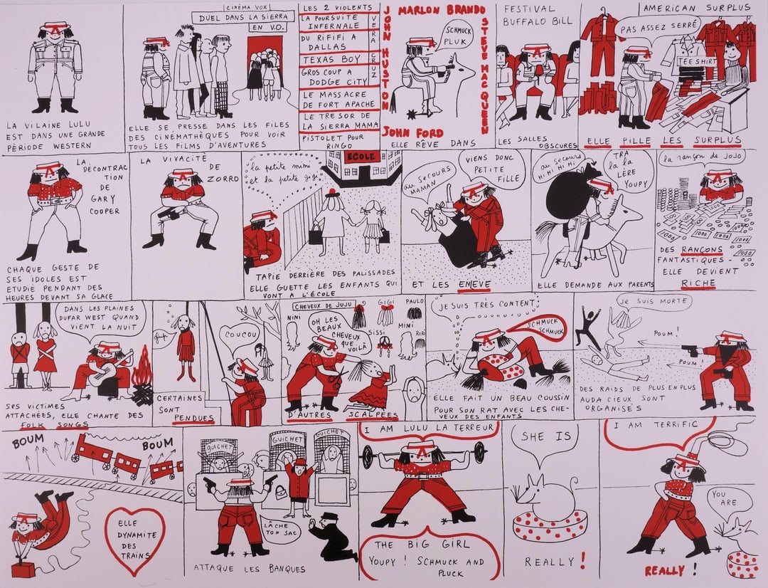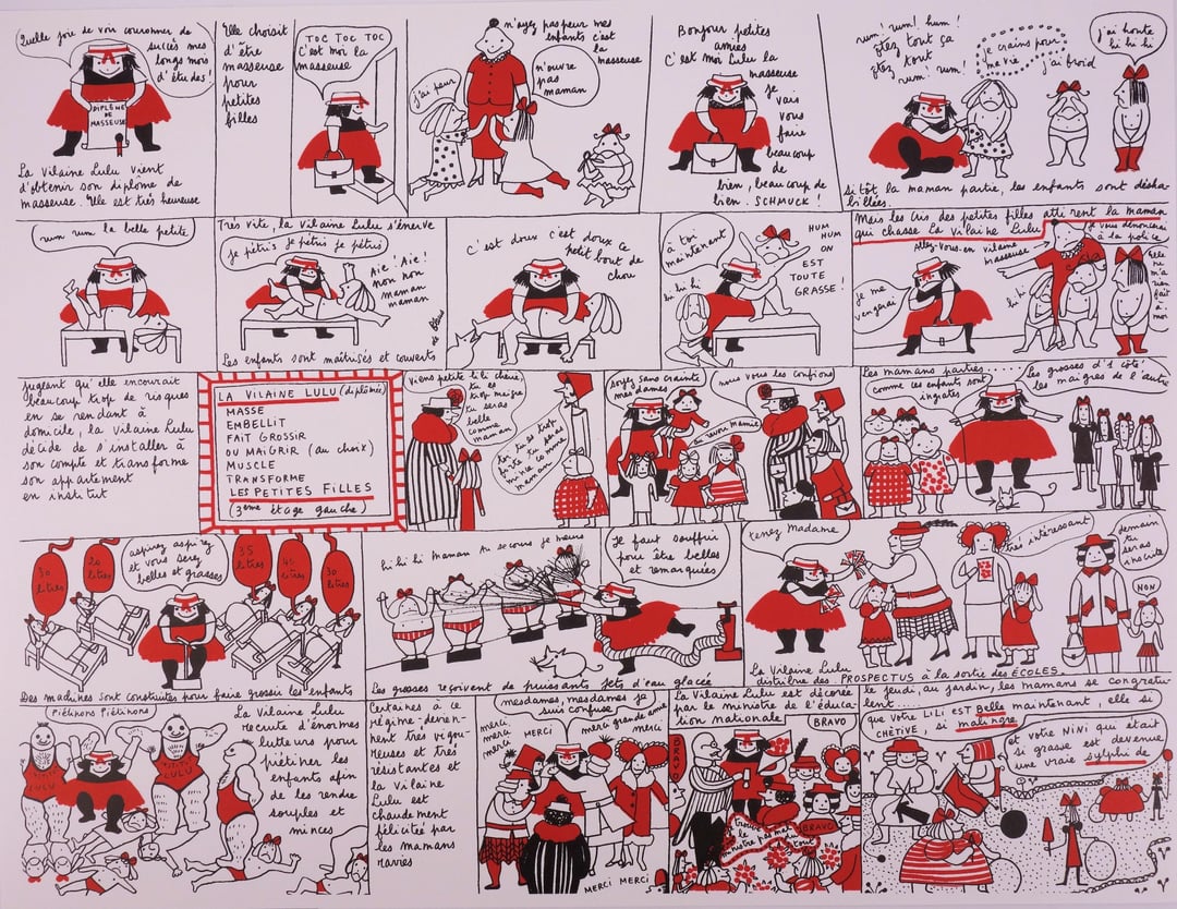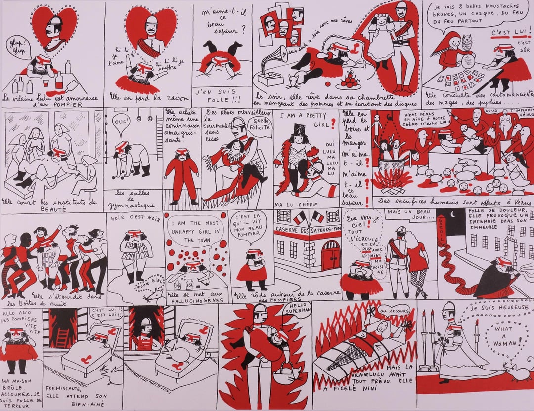 Évidemment malgré le mot signé par YSL, toute critique de l’œuvre s’attache à sourire d’un si incroyable “imaginaire parodique de son époque et de son milieu” comme si on était sur une œuvre mignonne et mutine. Vous noterez une case où elle est décorée par le ministre de l’éducation nationale, ou quand elle est amoureuse du pompier subitement une “red room” avec décapitation de bébé et autres sacrifices au nom de la déesse Vénus…