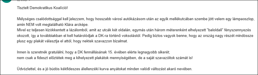 Molti di voi hanno indicato che la sovvenzione DK ha raggiunto proporzioni tossiche nel vostro distretto, che il denaro mondiale viene utilizzato per una causa morta da qualche fonte misteriosa. In qualsiasi punto della città, girando in qualsiasi direzione, ci sono più Klára che non Klára. Anche più di Fidesz.