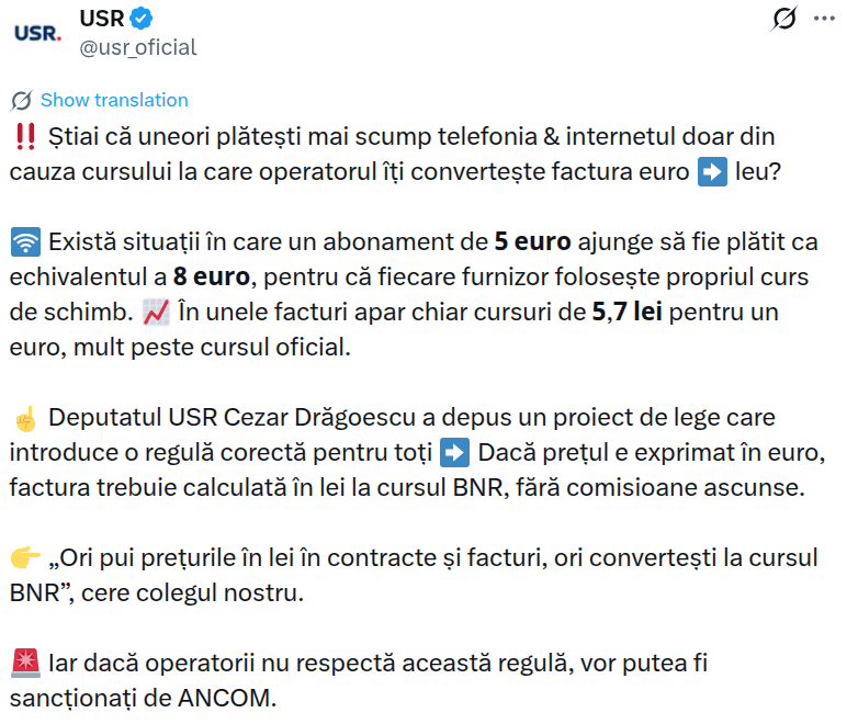 Il deputato dell’USR Cezar Drăgoescu ha presentato la fattura, se il prezzo è espresso in euro, la fattura dovrà essere calcolata in lei al tasso BNR, senza commissioni nascoste. “O inserisci i prezzi in lei nei contratti e nelle fatture, oppure convertili al tasso BNR”