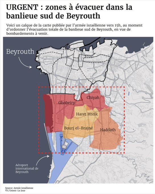 >Voici un calque de la carte publiée par l’armée israélienne vers 15h, au moment d’ordonner l’évacuation totale de la banlieue sud de Beyrouth, en vue de bombardements à venir.