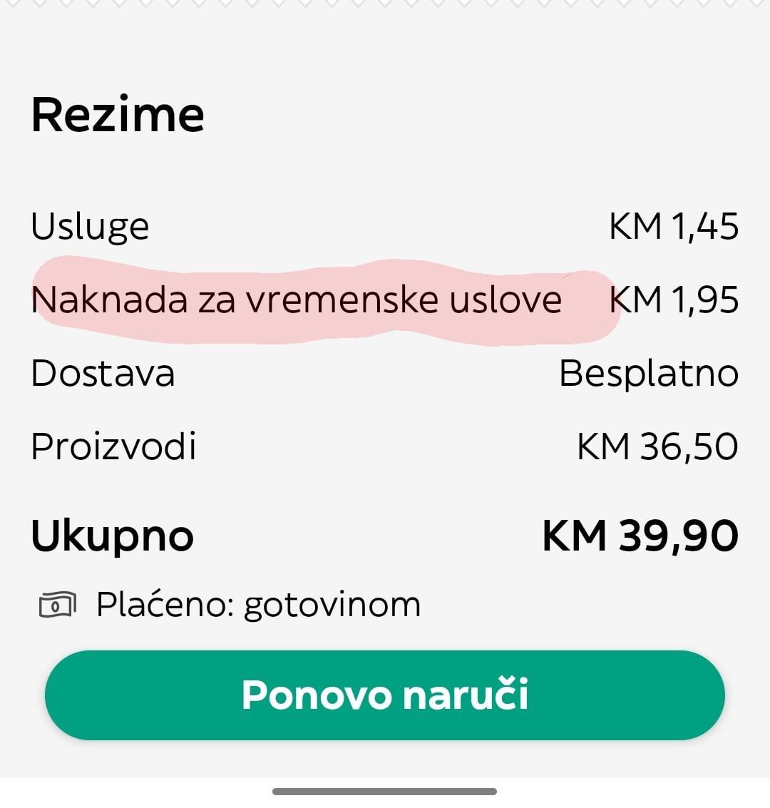 Nisam siguran ali mislim da je to sve do njihovog glavnog ureda u Njemačkoj ili gdje već bude, isti određuje koeficijente dostave za dostavljače i slične stvari pa i te naknade na osnovu informacija s terena. Znam kada je baš loše vrijeme da onda dostavljači preko nekog linka šalju zahtjeve da se poveća koeficijent za loše vremenske uslove. E sad to je vjerovatno ostao veći koef. nego što je trebalo, nisu ga na vrijeme skinuli.