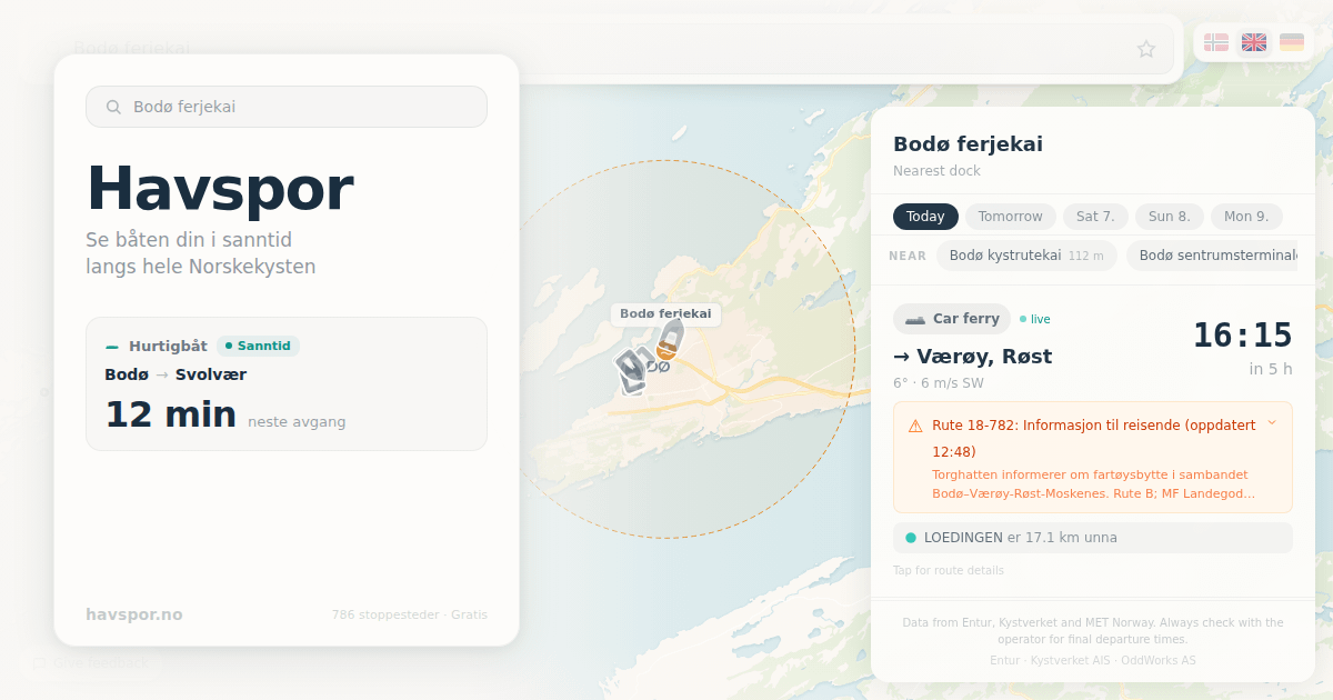 L’ho costruito come sviluppatore solista utilizzando i dati del governo aperto già presenti (Entur per le partenze, Kystverket AIS per le posizioni delle navi, MET.n per il meteo). Gratuito, nessun login, nessuna pubblicità.