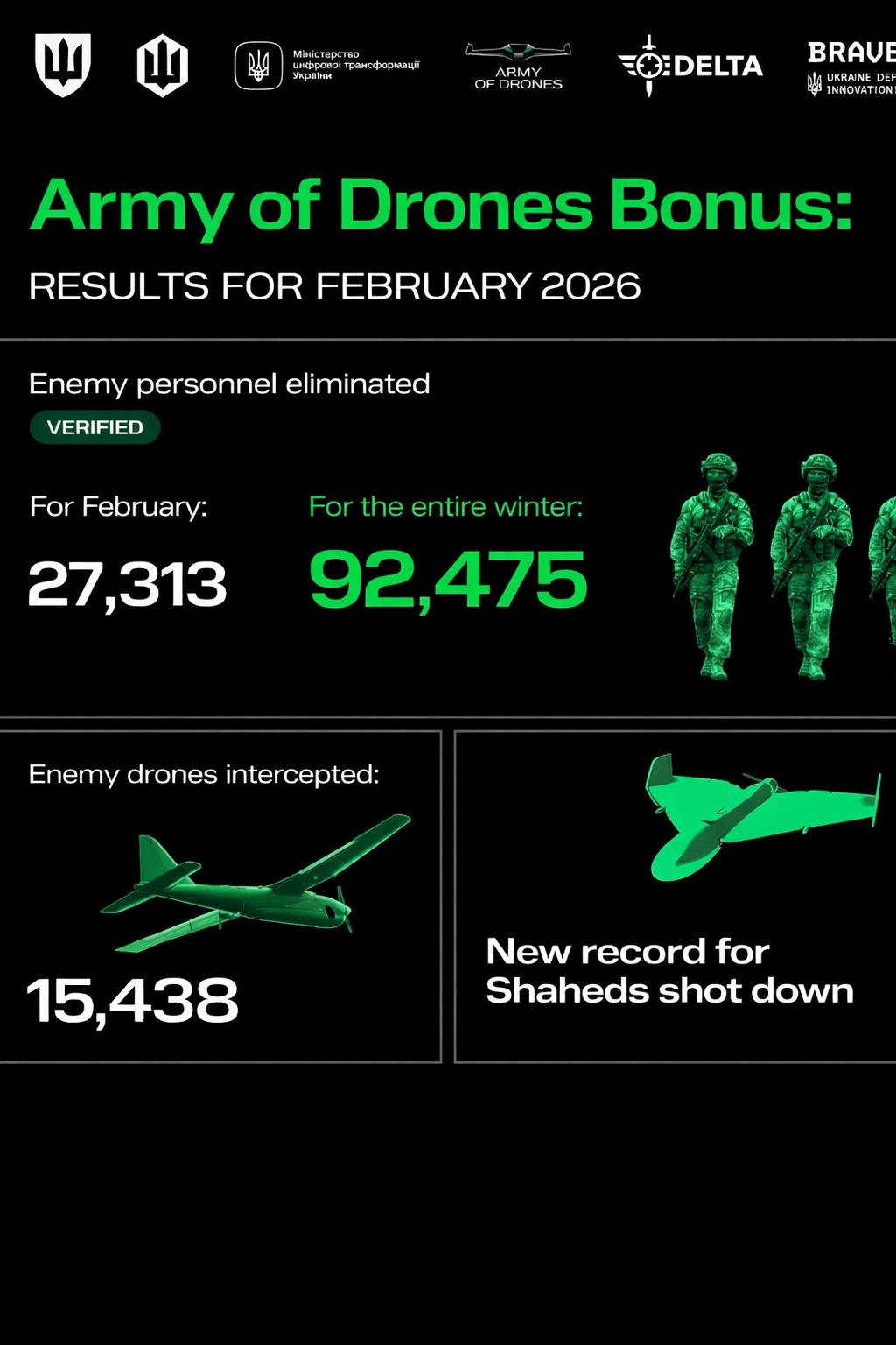 Le forze di difesa ucraine hanno eliminato 92.475 soldati russi quest’inverno, secondo i dati verificati delle unità che partecipano al programma Army of Drones Bonus. 88.898 sono stati colpiti dai droni, mentre il resto sono stati colpi di artiglieria confermati in video. Solo nel mese di febbraio sono state eliminate 27.313 truppe russe, circa 975 al giorno. Le forze ucraine hanno anche stabilito un nuovo record nell’intercettazione degli UAV nemici, distruggendo 15.438 droni, incluso un numero record di droni Shahed per il secondo mese consecutivo. 147 unità militari hanno riportato missioni di successo utilizzando droni e sistemi robotici – il 25% in più rispetto a gennaio – mentre l’Ucraina continua ad espandere la robotica sul campo di battaglia e la guerra con i droni. Fonte: Il ministro della Difesa ucraino Mykhailo Fedorov tramite WhatsApp.