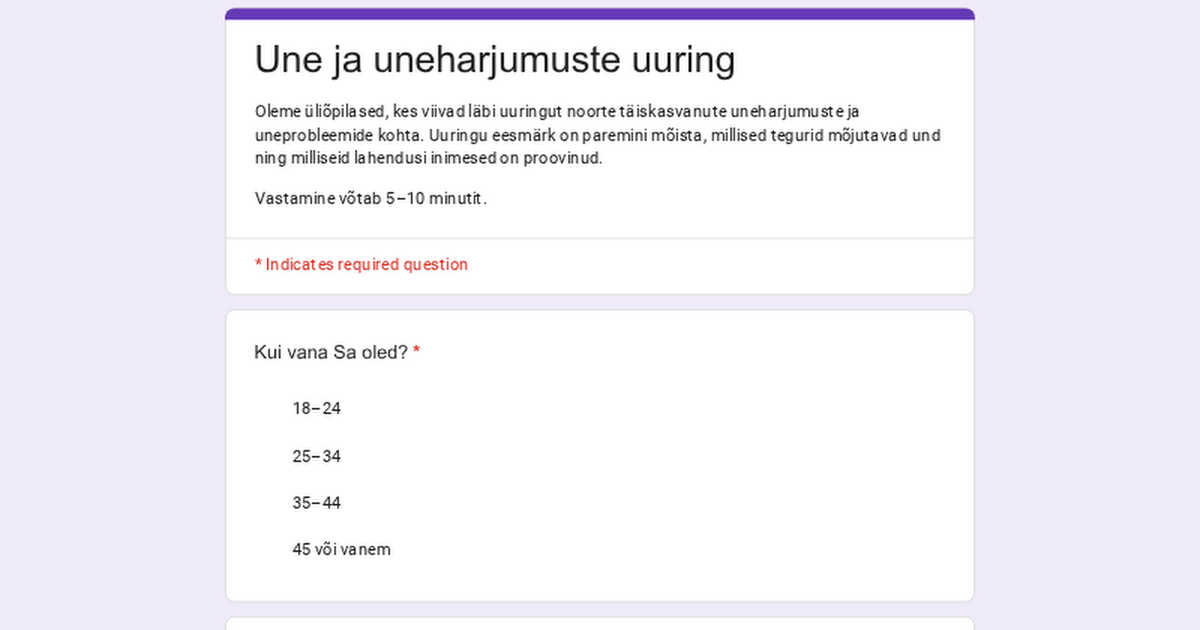 Palun abi tudengi uurimistöö jaoks – küsimustik uneharjumuste kohta (5–10 min)